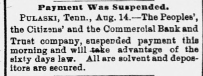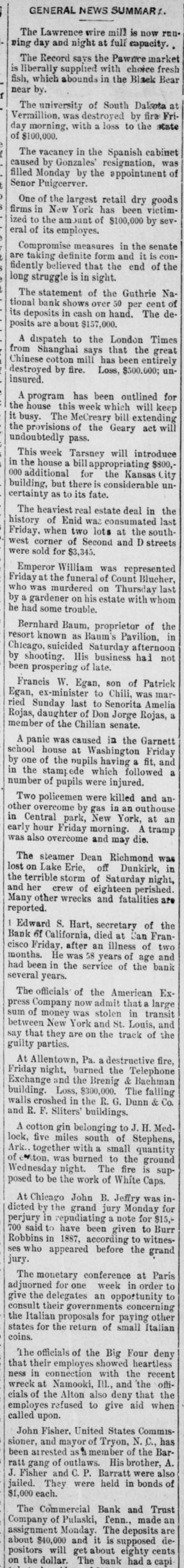 GENERAL NEWS SUMMAR The Lawrence wire mill is now runwing day and night at full capacity. The Record says the Pawnce market is liberally supplied with choice fresh fish, which abounds in the Black Bear near by. The university of South Dakota at Vermillion, was destroyed by fire Friday morning, with a loss to the state of $100,000. The vacancy in the Spanish cabinet caused by Gonzales' resignation, was filled Monday by the appointment of Senor Puigcerver. One of the largest retail dry goods firms in New York has been victimized to the am ount of $100,000 by several of its employes. Compromise measures in the senate are taking definite form and it is confidently believed that the end of the long struggle is in sight. The statement of the Guthrie National bank shows over 50 per cent of its deposits in cash on hand. The deposits are about $157,000. A dispatch to the London Times from Shanghai says that the great Chinese cotton mill has been entirely destroyed by fire. Loss, $500.000; uninsured. A program has been outlined for the house this week which will keep it busy. The McCreary bill extending the provisions of the Geary act will undoubtedly pass. This week Tarsney will introduce in the house a bill appropriating $800,000 additional for the Kansas City building, but there is considerable uncertainty as to its fate. The heaviest real estate deal in the history of Enid was consumated last Friday, when two lots at the southwest corner of Second and D streets were sold for $3,345. Emperor William was represented Friday at the funeral of Count Blucher, who was murdered on Thursday last by a gardener on his estate with whom he had some trouble. Bernhard Baum, proprietor of the resort known as Baum's Pavilion, in Chicago, suicided Saturday afternoon by shooting. His business had not been prospering of late. Francis W. Egan, son of Patrick Egan, ex-minister to Chili, was married Sunday last to Senorita Amelia Rojas, daughter of Don Jorge Rojas, a member of the Chilian senate. A panic was caused in the Garnett school house at Washington Friday by one of the pupils having a fit, and a in the stampede which followed number of pupils were injured. Two policemen were killed and another overcome by gas in an outhouse in Central park, New York, at an early hour Friday morning. A tramp was also overcome and may die. The steamer Dean Richmond was lost on Lake Erie, off Dunkirk, in the terrible storm of Saturday night, and her crew of eighteen perished. Many other wrecks and fatalities are reported. 1 Edward S. Hart, secretary of the Bank 6f California, died at San Francisco Friday, after an illness of two months. He was 58 years of age and had been in the service of the bank several years. The officials of the American Express Company now admit that a large sum of money was stolen in transit between New York and St. Louis, and say that they are on the track of the guilty parties. At Allentown, Pa. a destructive fire, Friday night, burned the Telephone Exchange and the Brenig & Bachman building. Loss, $300,000. The falling walls croshed in the R. G. Dunn & Co. and R. F. Sliters' buildings. A cotton gin belonging to J. H. Medlock, five miles south of Stephens, Ark., together with a small quantity of exton, was burned to the ground Wednesday night. The fire is supposed to be the work of White Caps. At Chicago John B. Jeffry was indicted by the grand jury Monday for perjury in repudiating a note for $15,700 said to have been given to Burr Robbins in 1887, according to witnesses who appeared before the grand jury. The monetary conference at Paris adjuorned for one week in order to give the delegates an opportunity to consult their governments concerning the Italian proposals for paying other states for the return of small Italian coins. The officials of the Big Four deny that their employes showed heartless ness in connection with the recent wreck at Namooki, Ill., and the officials of the Alton also deny that the employes refused to give aid when called upon. John Fisher, United States Commissioner, and mayor of Tryon, N. C., has been arrested as a member of the Barratt gang of outlaws. His brother, A. J. Fisher and C. P. Barratt were also jailed. They were held in bonds of $1,000 each. The Commercial Bank and Trust Company of Pulaski, Tenn., made an assignment Monday. The deposits are about $40,000 and it is supposed depositors will get about eighty cents on the dollar. The bank had a capi