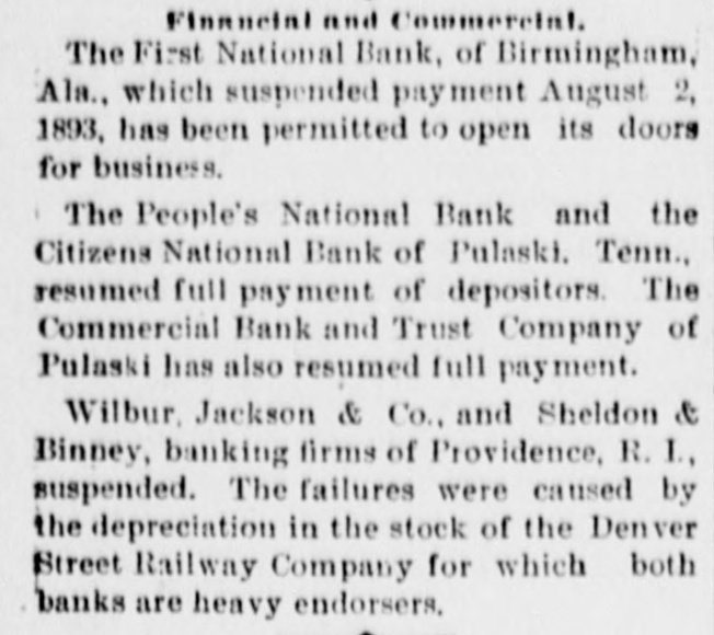 Financial and Commercial. The First National Bank, of Birmingham, Ala., which suspended payment August 2, 1893, has been permitted to open its doors for business. The People's National Bank and the Citizens National Bank of Pulaski. Tenn., resumed full payment of depositors. The Commercial Bank and Trust Company of Pulaski has also resumed full payment. Wilbur, Jackson & Co., and Sheldon & Binney, banking firms of Providence, R. I., suspended. The failures were caused by the depreciation in the stock of the Denver Street Railway Company for which both banks are heavy endorsers.