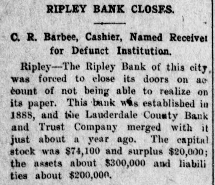 RIPLEY BANK CLOSES. C. R. Barbee, Cashier, Named Receiver for Defunct Institution. Ripley-The Ripley Bank of this city was forced to close its doors on ac count of not being able to realize on its paper. This bank was established in 1888, and the Lauderdale County Bank and Trust Company merged with it just about a year ago. The capital stock was $74,100 and surplus $20,000; the assets about $300,000 and liabili ties about $200,000.
