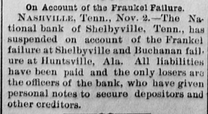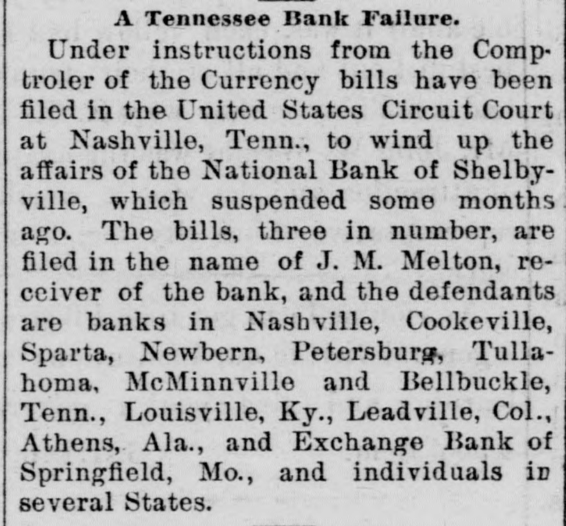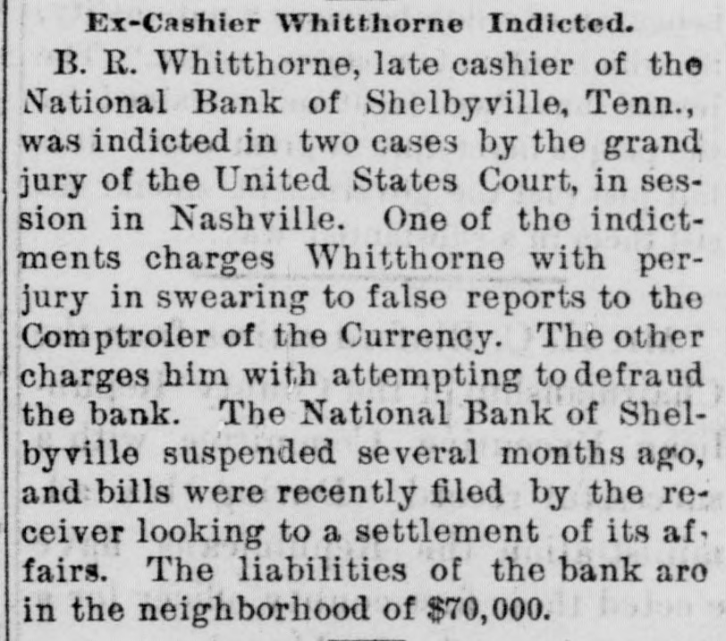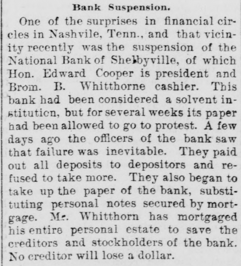 Bank Suspension. One of the surprises in financial circles in Nashvile, Tenn., and that vicinity recently was the suspension of the National Bank of Shelbyville, of which Hon. Edward Cooper is president and Brom. B. Whitthorne cashier. This bank had been considered a solvent institution, but for several weeks its paper had been allowed to go to protest. A few days ago the officers of the bank saw that failure was inevitable. They paid out all deposits to depositors and refused to take more. They also began to take up the paper of the bank, substituting personal notes secured by mortgage. Mr. Whitthorn has mortgaged his entire personal estate to save the creditors and stockholders of the bank. No creditor will lose a dollar.