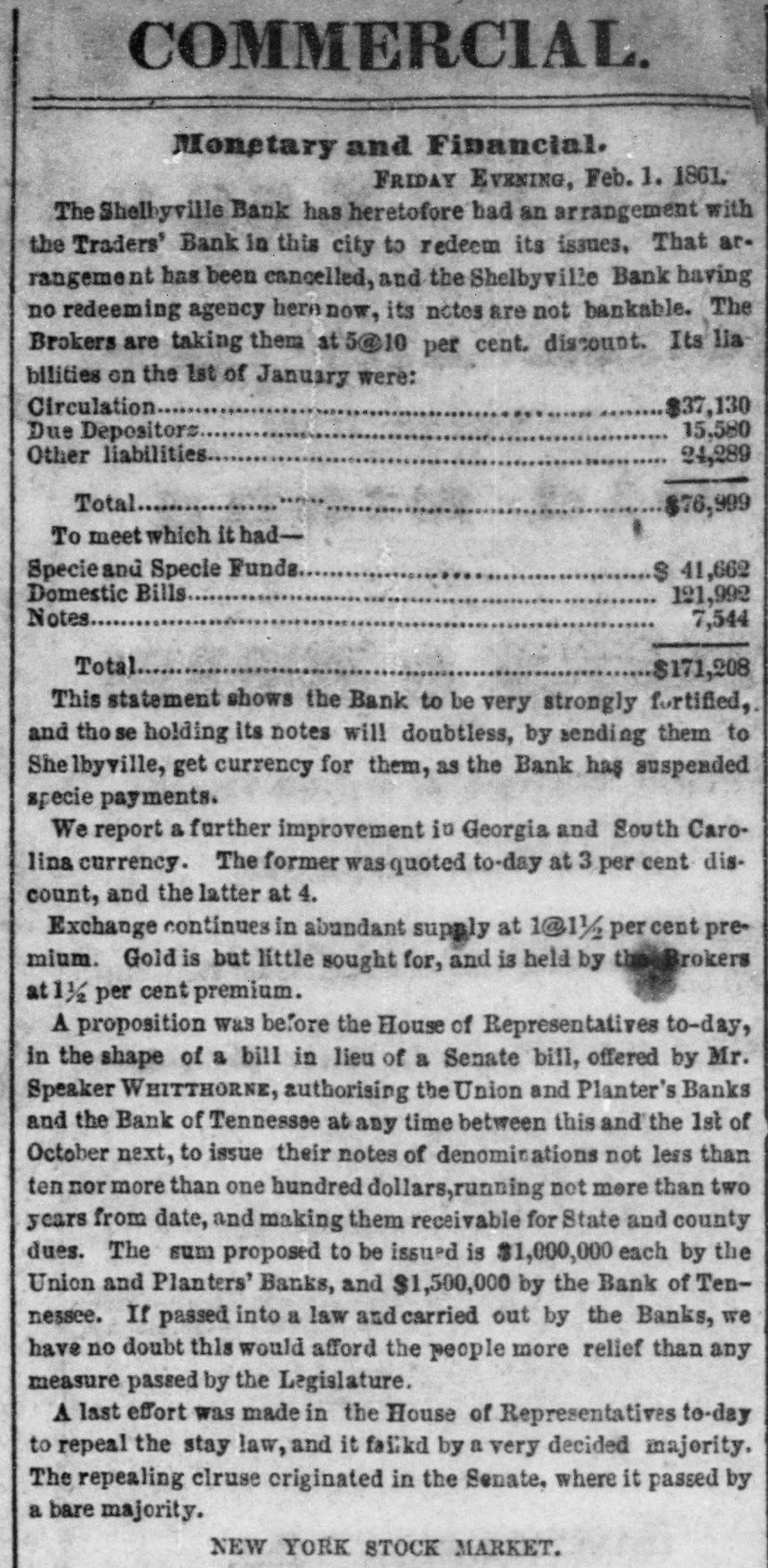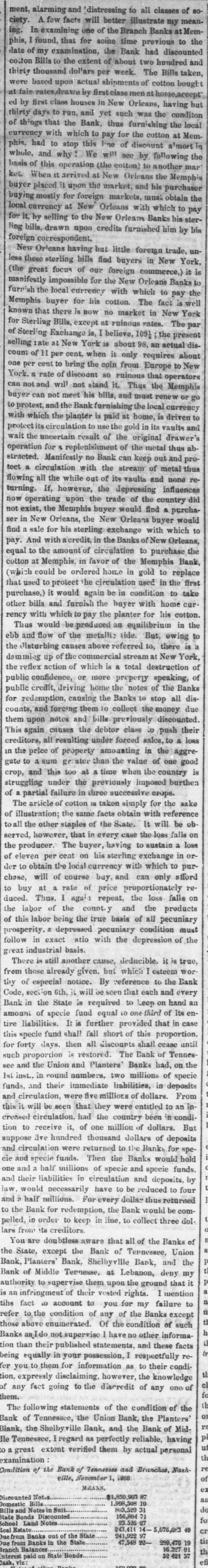-08 JO classes II" 03 pus Surmary ciety. A few facts will better illustrate my meanBranch the Jo euo Suy phis, found, that for soine time previous to the date of my examination, the Bank had discounted cotton Bills to the extent of about two hundred and thirty thousand dol'ars per week. The Bills taken, were based upon actual shipments of cotton bough at fair rates,drawn by first class men at home,accept ed by first class houses in New Orleans, having but thirty days to run, and yet such was the conditon of things that the Bank, thus furnishing the local currency with which to pay for the cotton at Memas piscount Jo out siq1 dots 01 had 'sryd whole, and why We will see by following the basis of this operation (the eotton) to another mar ket. When it arrived at New Orleans the Memphis buyer placed it upon the market, and his purchaser buying mostly for foreign markets, must obtain the local currency at New Orleans with which to pay for by selling to the New Orleans Banks his sterling bills, drawn upon credits furnished him by bis foreign correspondent. New Orleans having but little foreign trade, unless these sterling bills find buyers in New York, st 4! ano jo focus Breat )the manifestly impossible for the New Orleans Banks to furnish the local currency with which to pay the Memphis buyer for his cotton. The fact is well known that there is now no market in New York for Sterling Bills, except at ruinous rates. The par quesand : 1601 believe "st Sugars Jo selling rate at New York is about 98, an actual discount of 11 per cent, when it only requires about one per cent to bring the coin from Europe to New York. 8 rate of discount so ruinous that operators can not and will not stand it. Thus the Memphis buyer can not meet his bills, and must renew or go to protest, and the Bank furnishing the local currency 04 usang 81 home 18 pind 81 planter the which protect its circulation to use the gold in its vaults and wait the uncertain result of the original drawer's operation for 8 replenishment of the metal thus abstracted. Manifestly no Bank can keep out and protect a circulation with the stream of metal thus -ast euou pus 61! 10 no while the II" Surmoy turning. If, however, the depressing influences PIP country am jo орвл the uodn operature Mou not exist, the Memphis buyer would find & purchaser in New Orleans, the New Orleans buyer would find a sale for his sterling exchange with which to pay. And with acredit, in the Banks of New Orleans, equal to the amount of circulation to purchase the cotton at Memphis, in favor of the Memphis Bank, (which could be ordered home in gold to replace that used to protect the circulation used in the first 02[1] 01 condition u! 09 mede pinom # ('esupand other bills and furnish the buyer with home cur rency with which to pay the planter for his cotton. Thus would be produced an equilibrium in the 04 Surme and appli metal the Jo Moy put qqa the disturbing causes above referred to, there is damming up of the commercial stream at New York, the reflex action of which is R total destruction of public confidence, or more preperly speaking, of public credit, driving home the notes of the Banks -sip II" dois 01 Banks the canaling Joj onp money am collect 01 them Subject puv country them upon notes and bills previously discounted. This again causes the debtor class to push their creditors, all resulting under forced sales, to a loss hhe u! Superous Maadead 10 en ut pood auo jo Anjua the uuq: JOJE " was 01 mus st country on when time ' 1" 001 sin pus 'do.ro pasodum the Jopun sdore successive chice u! Failure particl B jo The article of cotton IS taken simply for the sake of illustration; the same facts obtain with reference -qo eq II!M 41 mmg one 10 other the that served, however, that in every case the loss falls on the producer. The buyer, having to sustain a loss of eleven per cent on his sterling exchange in order to obtain the local currency with which to purрлода only use pus Anq counse Jo 111 chase -as paid jo B 111 Ang 01 duced. Thus, I again repeat, the loss falls on the labor of the count.y and the products of this labor being the true basis of all pecuniary prosperity, a depressed pecuniary condition must follow in exact atio with the depression of the great industrial basis. There is still another cause, deducible. it is true, from those already given. but which esteem wor thy of especial notice. By reference to the Bank Code, sec on 6th, it will be seen that each and every UB has uo dear 04 ST State am u! Bank -ua #11 jo print euo 01 June punj speate Jo junome tire liabilities. It is further provided that in case this specie fund shall fall short of this proportion, until for forty days, then all discounts shall cease such proportion is restored. The Bank of Tennesand the Union and Planters' Banks had, on the specie jo millings OMT "staquinu puno. u! aas 181 funds, and their immediate liabilities, in deposits and circulation, were five millions of dollars. From this it will be seen that they were entitled to an increased circulation, had the country been in condition to receive it, of one million of dollars. But peperits 10 pursnoqi ag asoddns and circulati were returned to the Banks for specie and specie funds. Then the Banks would hold one and a half millions of specie and specie funds. 4q susodep pur checkstic a! amount per anoj 01 eq 01 DAVE Decessarily plnom MIL and a half millions. For every dollar thus returned to the Bank for redemption, the Bank would be compelled, in order to keep in line, to collect three dolcreditors 811 ano.y 8.18] You are doubtless aware that all of the Banks of the State, except the Bank of Tennessee, Union Bank, Planters Bank. Shelbyvllle Bank, and the Bank of Middle Ternesse, at Lebanon, deny my # THIS punoas am nodn them 01 is an infringment of their vested rights. I mention tihs fact to account to you for my failure to except Banks and Jo AUB jo condition the 01 refer those above enumerated. Of the condition of such