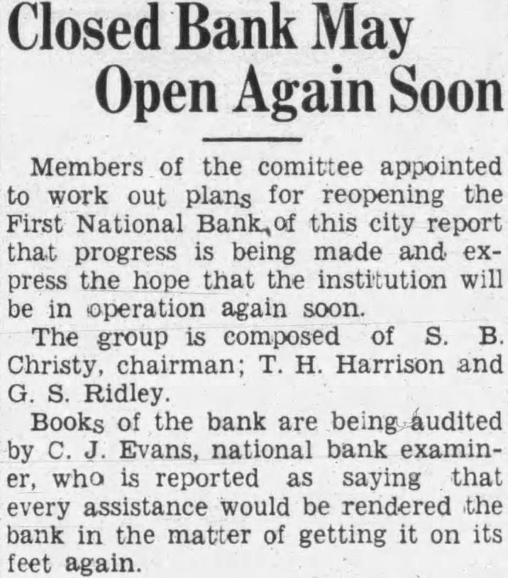 Members of the comittee appointed work plans for reopening the First National this city report that progress is being made and the hope that the institution operation again The group composed of Christy, chairman; Harrison and Ridley. Books of the bank are audited Evans, national bank who reported saying that every assistance would rendered the bank in the matter of getting its again.