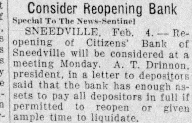 Consider Reopening Bank Feb. Reopening of Citizens' Bank of Sneedville will be considered at meeting Monday. Drinnon. president, letter to depositors said that the bank has enough sets to pay all depositors in full permitted to reopen given ample time to liquidate.