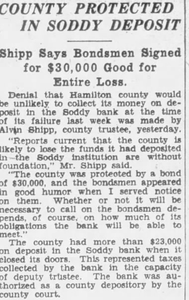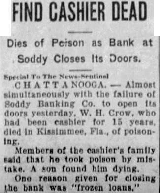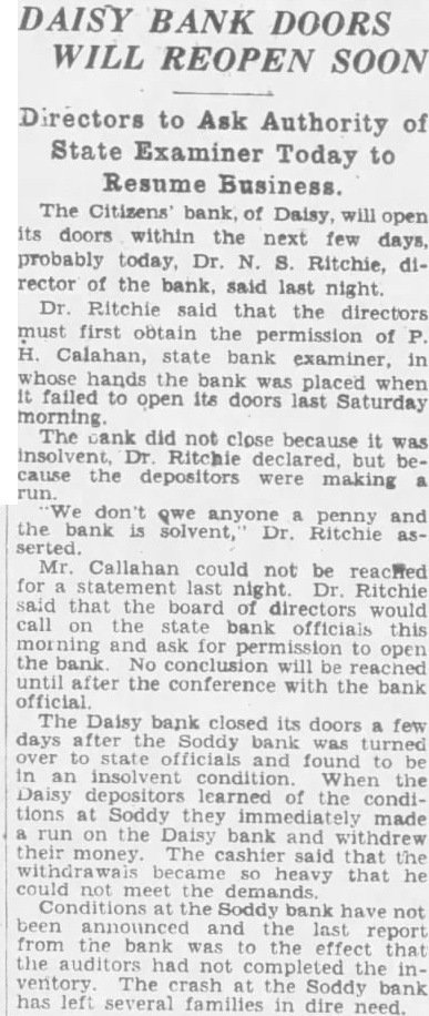 BANK CLOSES DOORS the excitement and heavy withdrawls occasioned by the failure the Soddy the Citizen's bank of Daisy, 15 miles from Chattanooga, closed its doors about noon failed to bank Officials declare the closing only and was done to protect the bank against run. The State bank examiner at work on the books of the elosed Soddy bank called to inspect the books of the Daisy bank.
