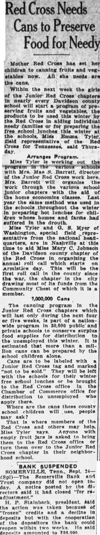 Red Cross Needs Cans to Preserve Food for Needy Mother Red Cross has set her children to canning fruits and vegetables now. All she needs are the cans. Within the next week the girls of the Junior Red Cross chapters in nearly every Davidson county school will start program of preserving fruits and vegetables, the products to be used this winter by the Red Cross in aiding individual needy families or for preparing the free school lunches this winter at the schools, Miss Emma Tyler, field representative of the Red Cross for Tennessee. said Thursday Arranges Program. Miss Tyler is working out the program various schools with Mrs. Mae S. Barrett, director of the Junior Red Cross work here. Mrs. Barrett will organize the work through the various school junior chapters with the aid of the home economics classes. Last year the same method was used in the schools throughout the winter in preparing hot lunches for children whose homes and farms had suffered in the drouth. Miss Tyler and G. S. Myer of Washington, special field representative from the national headquarters, are in Nashville at this time to aid Miss Mary C. Johnson of the Davidson county chapter of the Red Cross in organizing the annual roll call which starts on Armistice day This will be the first roll call in the county since the war, the chapter in the city drawing most of its funds from the Community Chest of which it is member. 1,000,000 Cans The canning program in the Junior Red Cross chapters which will last only during the next four or five weeks, is part of a nationwide program in 30,000 public and private schools to conserve surplus food supplies for distribution to the unemployed this winter. It is estimated that more than million cans can be prepared by the school children alone. Cans are to be labeled with Junior Red Cross tag and marked "not to be sold. They will be left with the schools for their winter free school lunches or be brought to the Red Cross office in the Chamber of Commerce office for distribution to unemployed who apply there. Where are the cans these county school children will use, people may ask? That is where members of the Red Cross and others may help. Miss Tyler says. Anyone with empty fruit jars is asked to bring them to the Red Cross office or turn them over to the Junior Red Cross chapter in their neighborhood school. BANK SUSPENDED SOMERVILLE, Tenn., Sept. 24(Spl)-The Somerville Bank and Trust company did not open today. A notice posted by the airectors said it had closed "for readjustment.' H. P. Stainback president. said the action was taken because of "frozen" credits and decline in deposits but with the cooperation of the depositors the bank could reopen within two weeks He said deposits amounted to 000