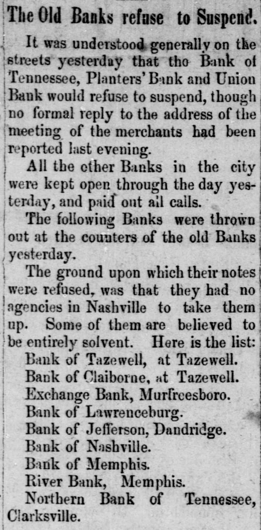 The Old Banks refuse to Suspend. It was understood generally on the streets yesterday that the Bank of Tennessee, Planters' Bank and Union Bank would refuse to suspend, though no formal reply to the address of the meeting of the merchants had been reported last evening. All the other Banks in the city were kept open through the day yesterday, and paid out all calls. The following Banks were thrown out at the counters of the old Banks yesterday. The ground upon which their notes were refused, was that they had no agencies in Nashville to take them up. Some of them are believed to be entirely solvent. Here is the list: Bank of Tazewell, at Tazewell. Bank of Claiborne, at Tazewell. Exchange Bank, Murfreesboro. Bank of Lawrenceburg. Bank of Jefferson, Dandridge. Bank of Nashville. Bank of Memphis. River Bank, Memphis. Northern Bank of Tennessee, Clarksville.