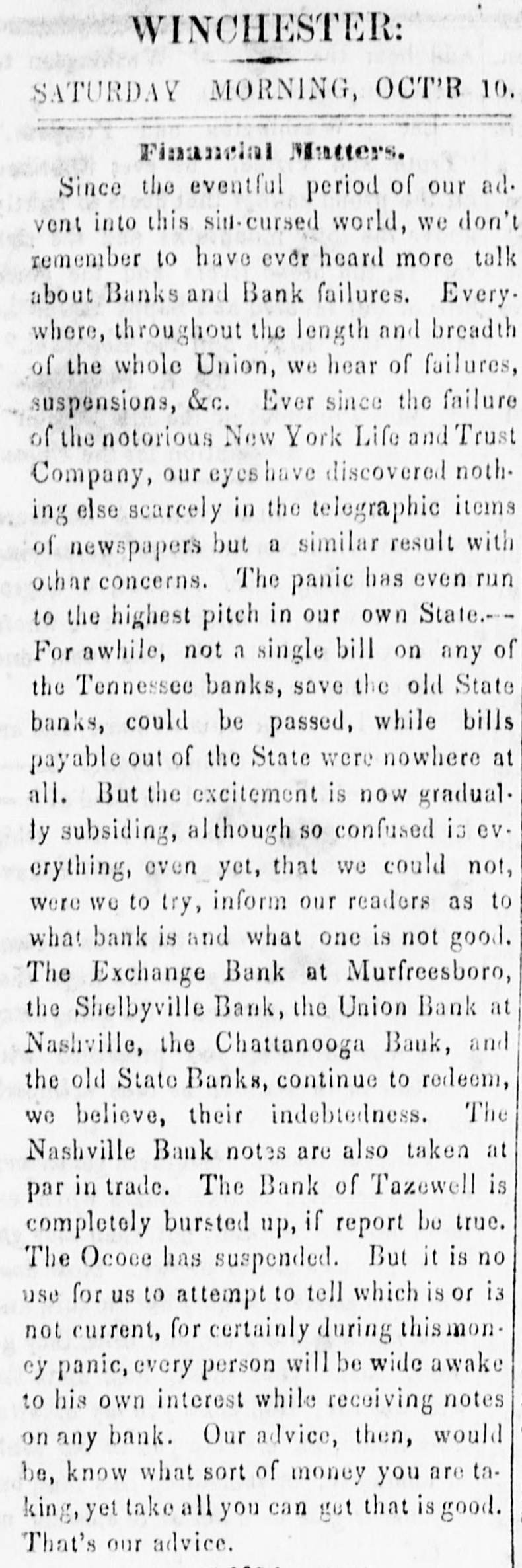 WINCHESTER: SATURDAY MORNING, OCT'R 10. Financial Matters. Since the eventful period of our ad. vent into this sin-cursed world, we don't remember to have ever heard more talk about Banks and Bank failures. Everywhere, throughout the length and breadth of the whole Union, we hear of failures, suspensions, &c. Ever since the failure of the notorious New York Life and Trust Company, our eyes have discovered nothing else scarcely in the telegraphic items of newspapers but a similar result with othar concerns. The panic has even run to the highest pitch in our own State.For awhile, not a single bill on any of the Tennessee banks, save the old State banks, could be passed, while bills payable out of the State were nowhere at all. But the excitement is now gradual1y subsiding, although so confused is everything, even yet, that we could not, were we to try, inform our readers as to what bank is and what one is not good. The Exchange Bank at Murfreesboro, the Shelbyville Bank, the Union Bank at Nashville, the Chattanooga Bank, and the old State Banks, continue to redeem, we believe, their indebtedness. The Nashville Bank notes are also taken at par in trade. The Bank of Tazewell is completely bursted up, if report be true. The Ocoee has suspended. But it is no use for us to attempt to tell which is or is not current, for certainly during thismoney panic, every person will be wide awake to his own interest while receiving notes on any bank. Our advice, then, would be, know what sort of money you are taking, yet take all you can get that is good. That's our advice.