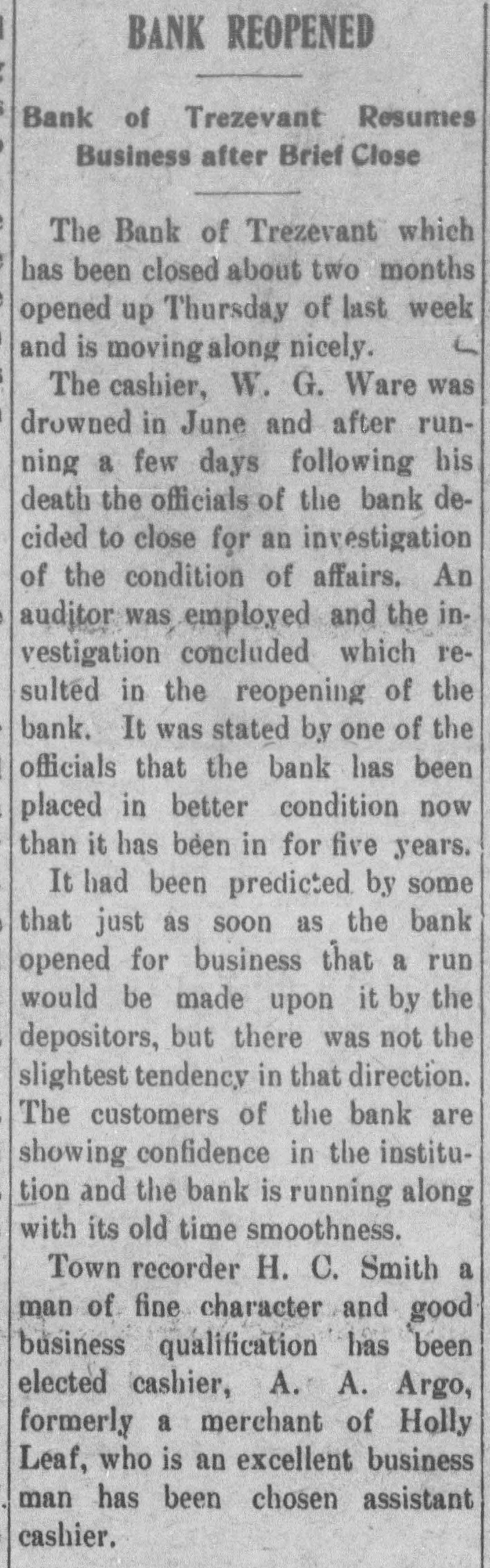 BANK REOPENED Bank of Trezevant Resumes Business after Brief Close The Bank of Trezevant which has been closed about two months opened up Thursday of last week and is moving along nicely. The cashier, W. G. Ware was drowned in June and after running a few days following his death the officials of the bank decided to close for an investigation of the condition of affairs. An auditor was employed and the investigation concluded which resulted in the reopening of the bank. It was stated by one of the officials that the bank has been placed in better condition now than it has been in for five years. It had been predicted by some that just as soon as the bank opened for business that a run would be made upon it by the depositors, but there was not the slightest tendency in that direction. The customers of the bank are showing confidence in the institution and the bank is running along with its old time smoothness. Town recorder H. C. Smith a man of fine character and good business qualification has been elected cashier, A. A. Argo, formerly a merchant of Holly Leaf, who is an excellent business man has been chosen assistant cashier.