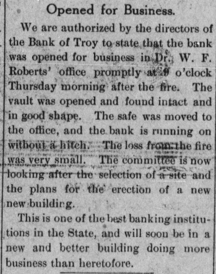 Opened for Business. We are authorized by the directors of the Bank of Troy to state that the bank was opened for business in Dr. W. F. Roberts' office promptly at 9 o'clock Thursday morning after the fire. The vault was opened and found intact and in good shape. The safe was moved to the office, and the bank is running on without a hitch. The loss from:the fire was very small. The committee is now looking after the selection of a site and the plans for the erection of a new new building. This is one of the best banking institutions in the State, and will soon be in a new and better building doing more business than heretofore.