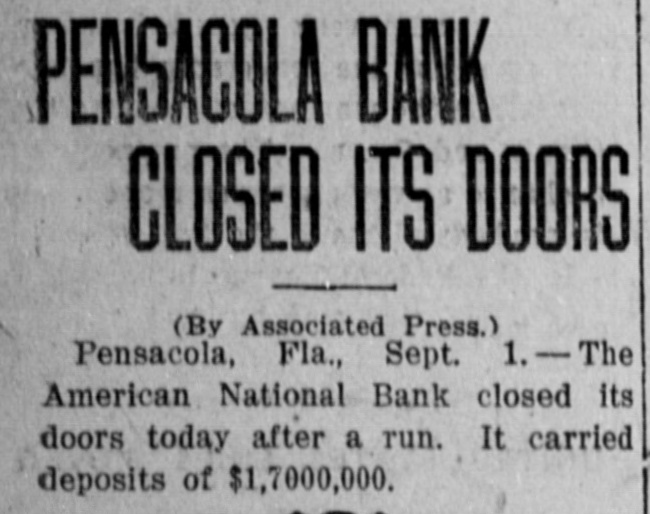 PENSACOLA BANK CLOSED ITS DOORS (By Associated Press) Pensacola, Fla., Sept. 1.-The American National Bank of Pensacola closed its doors today after a run lasting about an hour. Sensational reports circulated yesterday are responsible. The streets were crowded after the doors closed. The officials refused to talk. The bank's capital is $300,000 with a surplus of $35,000; deposits $1,715,000. On Jan. 1 the loans and discounts totaled $2,000,000.