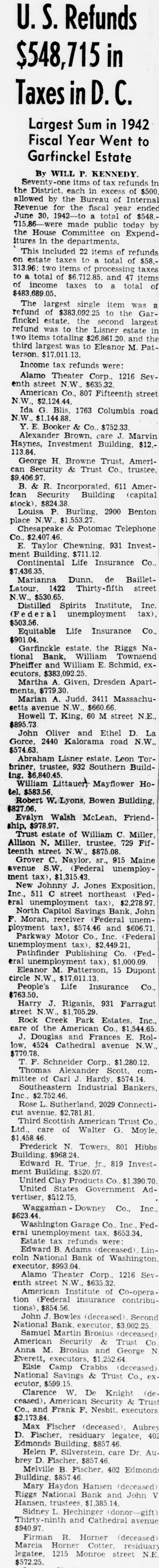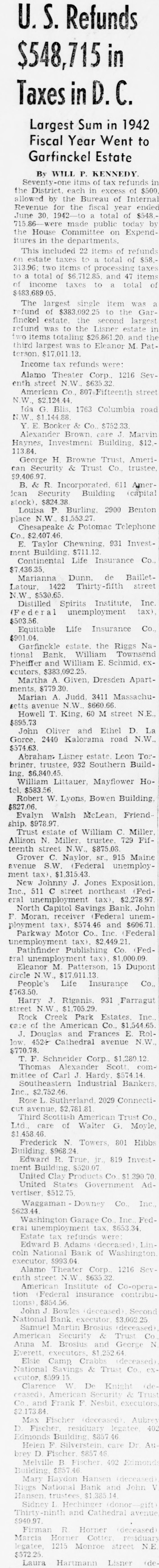 The largest single item was a refund of $383,092.25 to the Garfinckel estate, the second largest refund was to the Lisner estate in two items totaling $26.861.20, and the third largest was to Eleanor M. Patterson, $17,011.13.