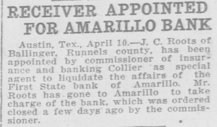 RECEIVER APPOINTED FOR AMARILLO BANK Austin, Tex., April 10.-J. C. Roots of Ballinger, Runnels county, has been appointed by commissioner of insurance and banking Collier as special agent to liquidate the affairs of the First State bank of Amarillo. Mr. Roots has gone to Amarillo to take charge of the bank, which was ordered closed a few days ago by the commissioner.