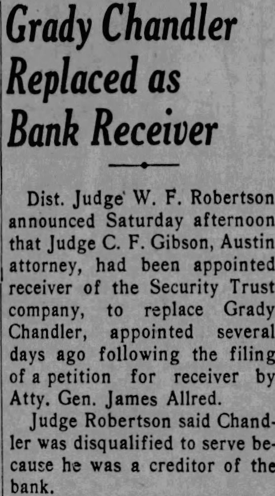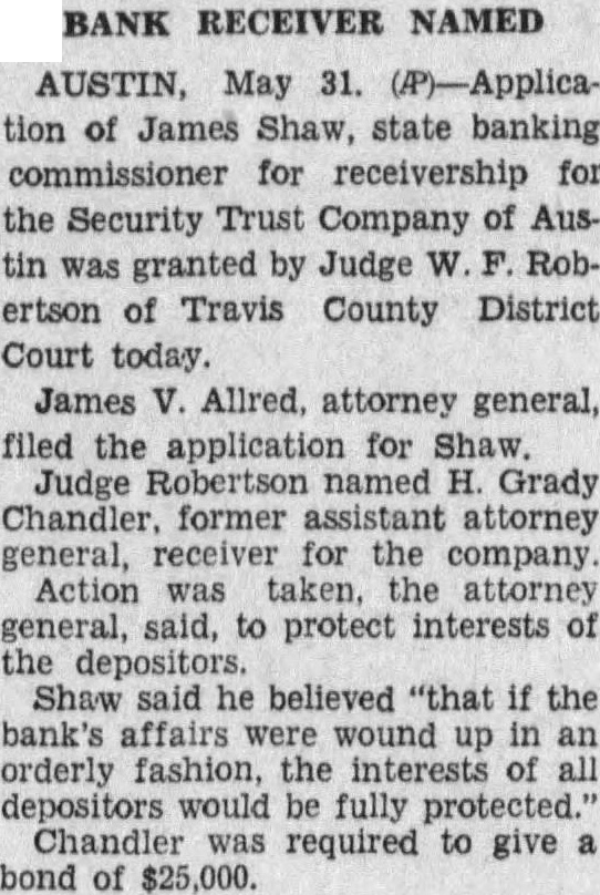 BANK RECEIVER NAMED AUSTIN, May 31. (P)-Application of James Shaw, state banking commissioner for receivership for the Security Trust Company of Austin was granted by Judge W. F. Robertson of Travis County District Court today. James V. Allred, attorney general, filed the application for Shaw. Judge Robertson named H. Grady Chandler, former assistant attorney general, receiver for the company Action was taken. the attorney general, said, to protect interests of the depositors. Shaw said he believed "that if the bank's affairs were wound up in an orderly fashion, the interests of all depositors would be fully protected.' Chandler was required to give a bond of $25,000.