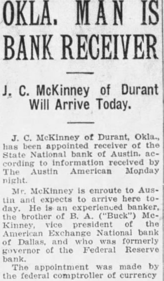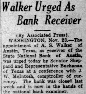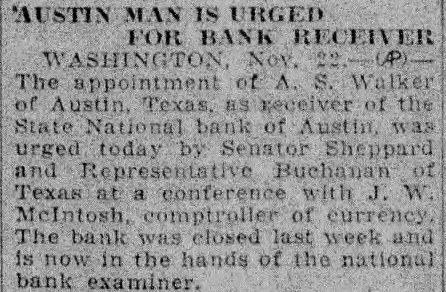 Receiver Pleased. Mr. the vice president and the bank from the old Receiver McKinney expressed his satisfaction that negotiations being carried whereby the old depositors the percentage of former the credits be the bank opens, instead of being tended long periods have been the case the liquidation and closing out of Institunot by another There more $765,000 belonging citizens tied up the old bank, was president the new bank, has long identified with Austin' bank among the widely known bankers Business Leaders Come Here. The organization the will add to Austin's circlas Hobby, president the Houston patch the Enterand W. R. Christie executive head the Lumberman's Reciprocal and the Men's Clopton is manager of the Stephen Augtin hotel Edwin conducted the of the brother of Gov has been here for days. charter the new bank was Monday the state board Faith Austin and Austin's future business prospects was pressed both Gov. Hobby his brother.