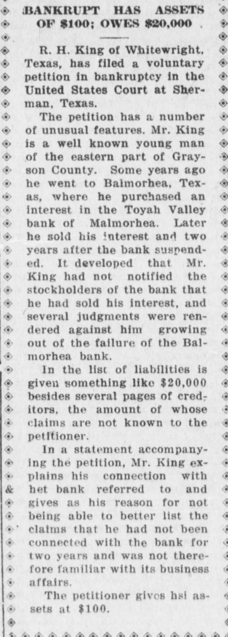# BANKRUPT HAS ASSETS OF $100; OWES $20,000 R. H. King of Whitewright, Texas, has filed a voluntary petition in bankruptcy in the United States Court at Sherman, Texas. The petition has a number of unusual features. Mr. King is a well known young man of the eastern part of Grayson County. Some years ago he went to Balmorhea, Texas, where he purchased an interest in the Toyah Valley bank of Malmorhea. Later he sold his interest and two years after the bank suspended. It developed that Mr. King had not notified the stockholders of the bank that he had sold his interest, and several judgments were rendered against him growing out of the failure of the Balmorhea bank. In the list of liabilities is given something like $20,000 besides several pages of creditors, the amount of whose claims are not known to the petitioner. In a statement accompanying the petition, Mr. King explains his connection with het bank referred to and gives as his reason for not being able to better list the claims that he had not been connected with the bank for two years and was not therefore familiar with its business affairs. The petitioner gives hsi assets at $100.