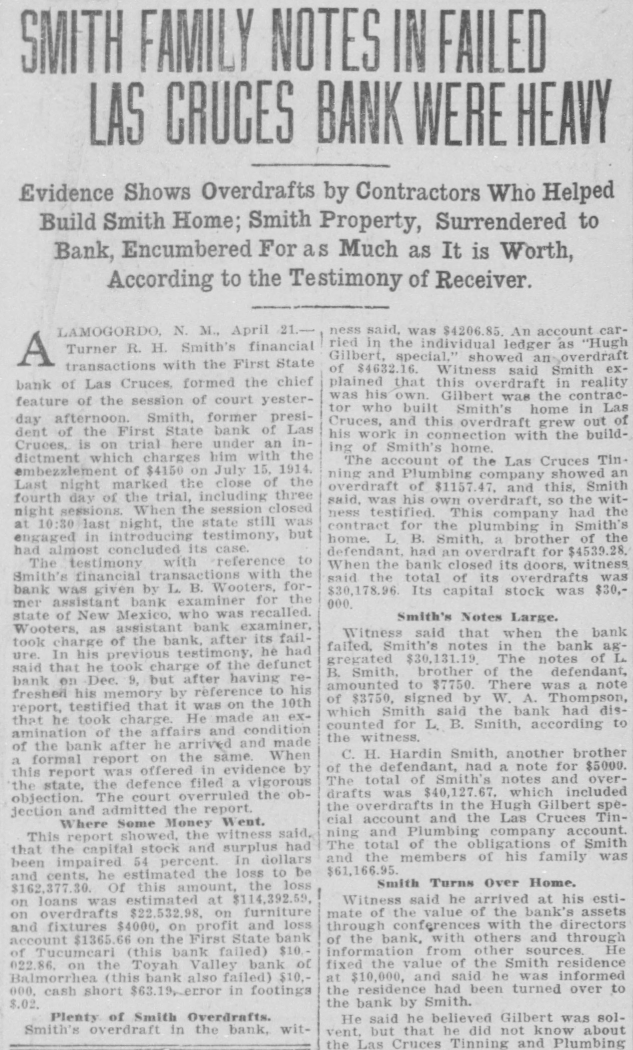 SMITH FAMILY NOTES FAILED LAS CRUCES BANK WERE HEAVY Evidence Shows Overdrafts by Contractors Who Helped Build Smith Home; Smith Property, Surrendered to Bank, Encumbered For as Much as It is Worth, According to the Testimony of Receiver. ness said, was $4206.85. An account carLAMOGORDO, N. M., April 21.ried in the individual ledger as "Hugh Turner R. H. Smith's financial Gilbert, special." showed an overdraft A transactions with the First State of $4632.16. Witness said Smith explained that this overdraft in reality bank of Las Cruces, formed the chief was his own. Gilbert was the contracfeature of the session of court yestertor who built Smith's home in Las day afternoon. Smith, former presiCruces, and this overdraft grew out of dent of the First State bank of Las his work in connection with the buildCruces, is on trial here under an ining of Smith's home. dictment which charges him with the The account of the Las Cruces Tinembezzlement of $4150 on July 15, 1914. ning and Plumbing company showed an Last night marked the close of the overdraft of $1157.47, and this, Smith fourth day of the trial, including three said, was his own overdraft, so the witnight sessions. When the session closed ness testified. This company had the at 10:30 last night, the state still was contract for the plumbing in Smith's engaged in introducing testimony, but home. L B. Smith, a brother of the had almost concluded its case. defendant, had an overdraft for $4539.28. The testimony with reference to When the bank closed its doors, witness Smith's financial transactions with the said the total of its overdrafts was bank was given by L. B. Wooters, for$30,178.96. Its capital stock was $30,mer assistant bank examiner for the 000. state of New Mexico, who was recalled. Smith's Notes Large. Wooters, as assistant bank examiner, Witness said that when the bank took charge of the bank, after its failfailed, Smith's notes in the bank agure. In his previous testimony, he had gregated $30,131.19. The notes of L. said that he took charge of the defunct B. Smith, brother of the defendant, bank on Dec. 9, but after having reamounted to $7750. There was a note freshed his memory by reference to his of $3750, signed by W. A. Thompson, report, testified that it was on the 10th which Smith said the bank had disthat he took charge. He made an excounted for L. B. Smith, according to amination of the affairs and condition the witness. of the bank after he arrived and made C. H. Hardin Smith, another brother a formal report on the same. When of the defendant, had a note for $5000. this report was offered in evidence by The total of Smith's notes and overthe state, the defence filed a vigorous drafts was $40,127.67. which included objection. The court overruled the obthe overdrafts in the Hugh Gilbert spèjection and admitted the report. cial account and the Las Cruces TinWhere Some Money Went. ning and Plumbing company account. This report showed, the witness said, The total of the obligations of Smith that the capital stock and surplus had and the members of his family was been impaired 54 percent. In dollars $61,166.95. and cents, he estimated the loss to be Smith Turns Over Home. $162,377.30. Of this amount, the loss Witness said he arrived at his estion loans was estimated at $114,392.59, mate of the value of the bank's assets on overdrafts $22,532.98, on furniture through conferences with the directors and fixtures $4000, on profit and loss of the bank, with others and through account $1365.66 on the First State bank information from other sources. He of Tucumeari (this bank failed) $10.fixed the value of the Smith residence 022.86, on the Toyah Valley bank of at $10,000, and said he was informed Balmorrhea (this bank also failed) $10,the residence had been turned over to 000, cash short $63.19, error in footings the bank by Smith. $.02. Plenty of Smith Overdrafts. He said he believed Gilbert was solSmith's overdraft in the bank, witvent, but that he did not know about the Las Cruces Tinning and Plumbing