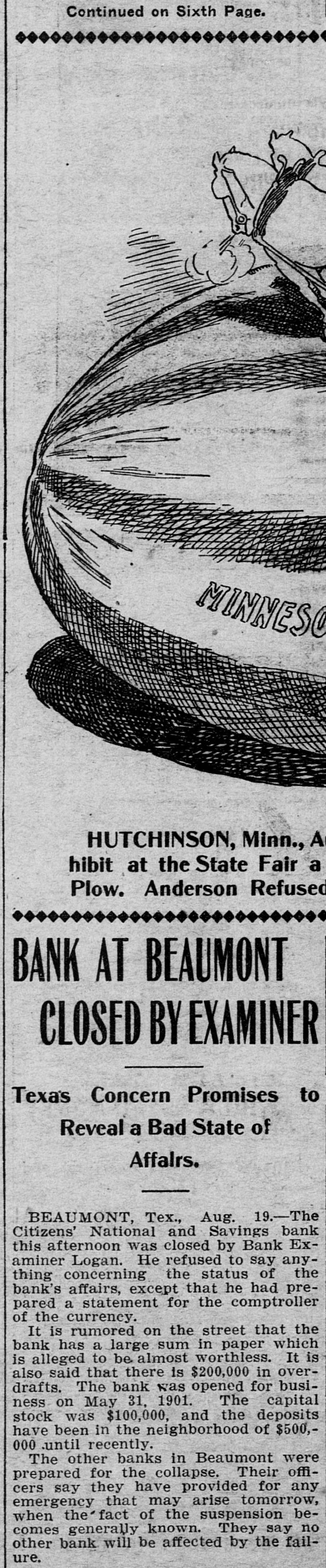 Continued on Sixth Page. MINNESO HUTCHINSON, Minn., A hibit at the State Fair a Plow. Anderson Refused BANK AT BEAUMONT CLOSED BY EXAMINER Texas Concern Promises to Reveal a Bad State of Affairs. BEAUMONT, Tex., Aug. 19.-The Citizens' National and Savings bank this afternoon was closed by Bank Examiner Logan. He refused to say any- the thing concerning the status of bank's affairs, except that he had prepared a statement for the comptroller of the currency. It is rumored on the street that the bank has a large sum in paper which is alleged to be almost worthless. It is also said that there is $200,000 in overdrafts. The bank was opened for business on May 31, 1901. The capital stock was $100,000, and the deposits have been in the neighborhood of $500,000 .until recently. The other banks in Beaumont were prepared for the collapse. Their offithey have provided for any that may the fact of the cers when emergency say arise suspension tomorrow, be- no comes generally known. They say other bank will be affected by the failure.
