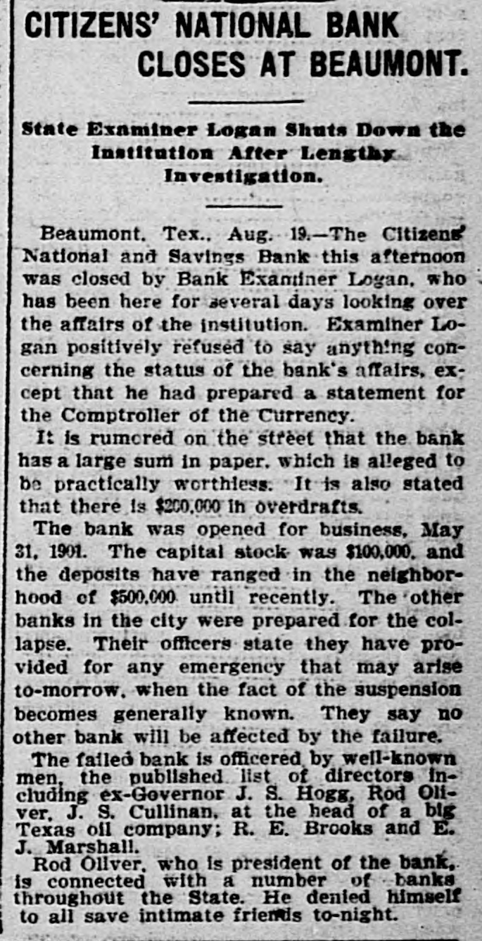CITIZENS' NATIONAL BANK CLOSES AT BEAUMONT. State Examiner Logan Shuts Down the Institution After Lengthy Investigation. Beaumont. Tex., Aug. 19.-The Citizens' National and Savings Bank this afternoon was closed by Bank Examiner Logan, who has been here for several days looking over the affairs of the institution. Examiner Logan positively refused to say anything concerning the status of the bank's affairs, except that he had prepared a statement for the Comptroller of the Currency. It is rumored on the street that the bank has a large sum in paper. which is alleged to be practically worthless. It is also stated that there is $200,000 in overdrafts. The bank was opened for business, May 31, 1901. The capital stock was $100,000. and the deposits have ranged in the neighborhood of $500,000 until recently. The other banks in the city were prepared for the collapse. Their officers state they have provided for any emergency that may arise to-morrow. when the fact of the suspension becomes generally known. They say no other bank will be affected by the failure. The failed bank is officered by well-known men, the published list of directors including ex-Governor J. S. Hogg, Rod Oliver, J. S. Cullinan, at the head of a big Texas oil company; R. E. Brooks and E. J. Marshall. Rod Oliver, who is president of the bank, is connected with a number of banks throughout the State. He denied himself to all save intimate friends to-night.