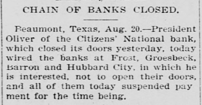 ANOTHER TEXAS BANK CLOSES ITS DOORS Result of Failure of Citizens' National, of Beaumont. The Comptroller of the Currency announced today that the Groesbeck National Bank, of Groesbeck, Texas, was closed by the cashier on the 20th instant, by direction of the president of the bank, as a result of the failure of the Citizens' National Bank, of Beaumont, Texas. National Bank Eminer J. W. Hertford has been appointed receiver. The failure of this bank is due to the same causes which led to the closing of the Citizens' National Bank-large excessive loans to R. Oliver, who was president of both associations, and to enterprises in which he was interested.