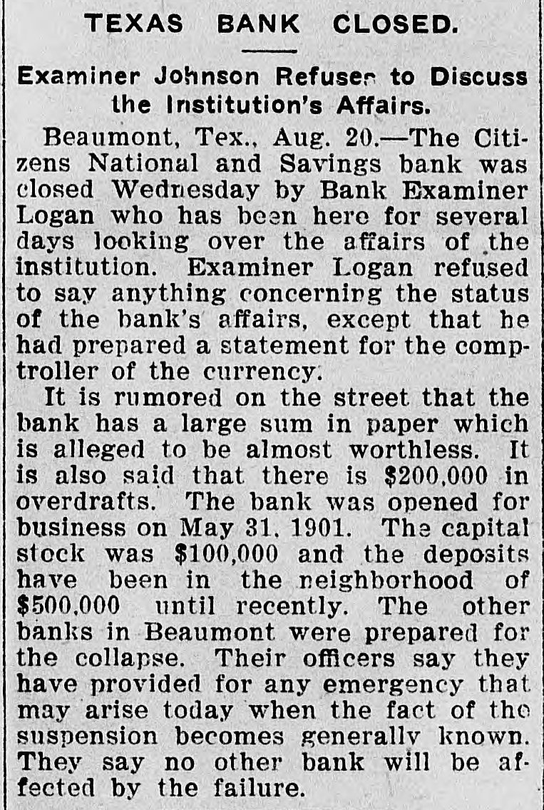 TEXAS BANK CLOSED. Examiner Johnson Refuser to Discuss the Institution's Affairs. Beaumont, Tex., Aug. 20.-The Citizens National and Savings bank was closed Wednesday by Bank Examiner Logan who has been here for several days looking over the affairs of the institution. Examiner Logan refused to say anything concerning the status of the bank's affairs, except that he had prepared a statement for the comptroller of the currency. It is rumored on the street that the bank has a large sum in paper which is alleged to be almost worthless. It is also said that there is $200,000 in overdrafts. The bank was opened for business on May 31. 1901. The capital stock was $100,000 and the deposits have been in the neighborhood of $500,000 until recently. The other banks in Beaumont were prepared for the collapse. Their officers say they have provided for any emergency that may arise today when the fact of the suspension becomes generally known. They say no other bank will be affected by the failure.