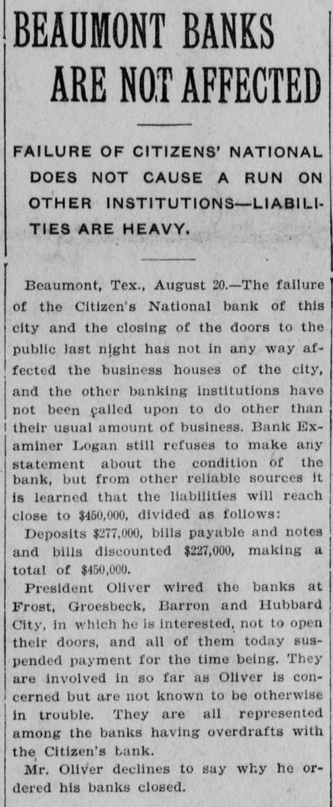 BEAUMONT BANKS ARE NOT AFFECTED FAILURE OF CITIZENS' NATIONAL DOES NOT CAUSE A RUN ON OTHER INSTITUTIONS-LIABILITIES ARE HEAVY. Beaumont, Tex., August 20.-The failure of the Citizen's National bank of this city and the closing of the doors to the public last night has not in any way affected the business houses of the city, and the other banking institutions have not been called upon to do other than their usual amount of business. Bank Examiner Logan still refuses to make any statement about the condition of the bank, but from other reliable sources it is learned that the liabilities will reach close to $450,000, divided as follows: Deposits $277,000, bills payable and notes and bills discounted $227,000, making a total of $450,000. President Oliver wired the banks at Frost, Groesbeck, Barron and Hubbard City, in which he is interested, not to open their doors, and all of them today suspended payment for the time being. They are involved in so far as Oliver is concerned but are not known to be otherwise in trouble. They are all represented among the banks having overdrafts with the Citizen's bank. Mr. Oliver declines to say why he ordered his banks closed.