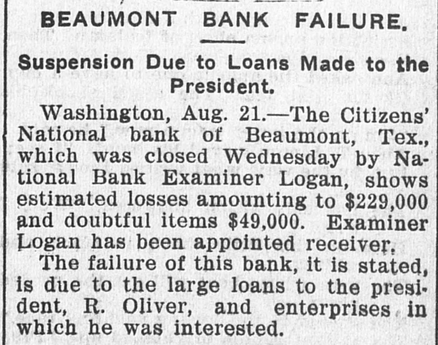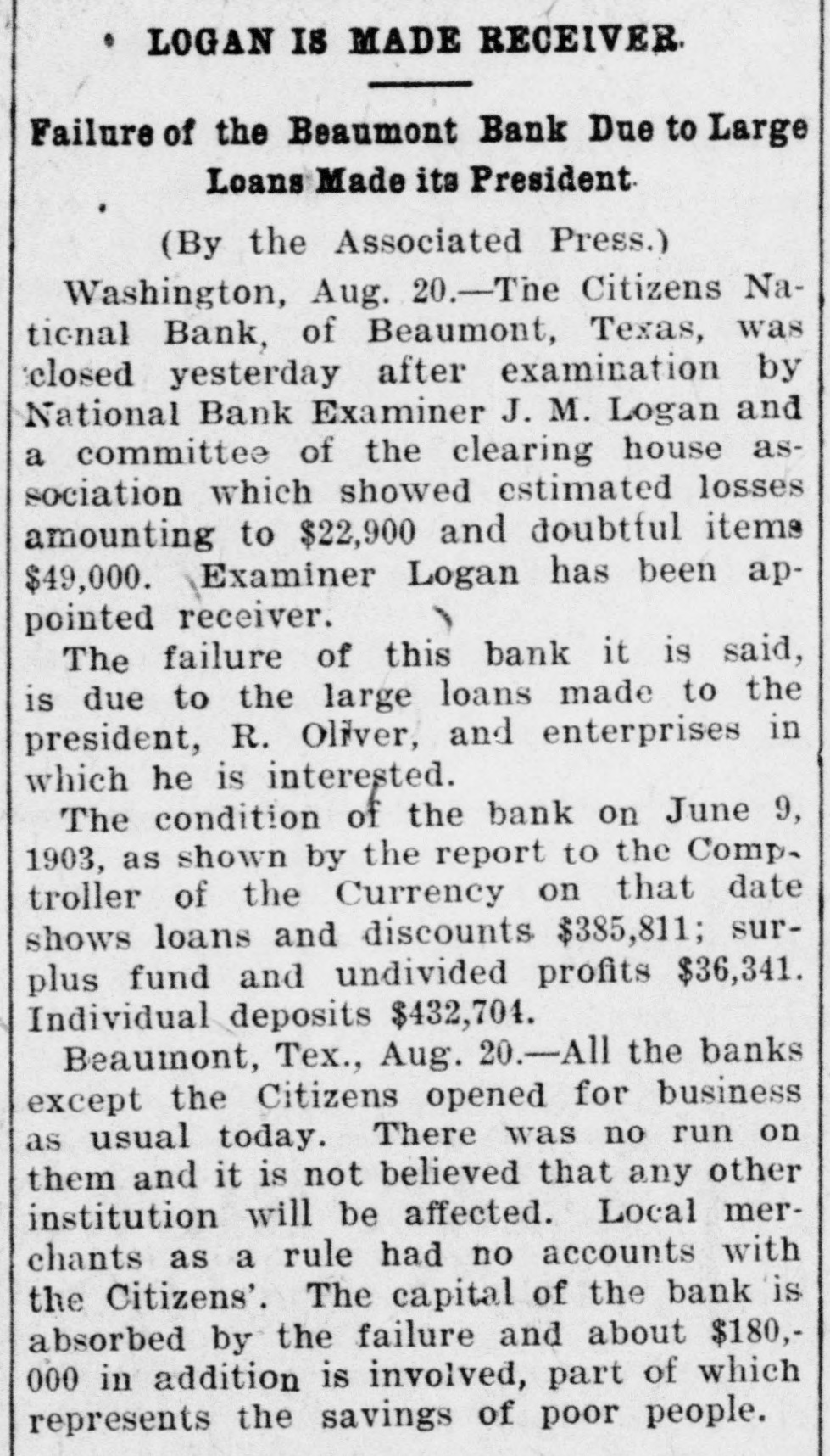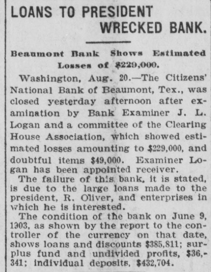 LOANS TO PRESIDENT WRECKED BANK. Beaumont Bank Shows Estimated Losses of $229,000. Washington, Aug. 20.-The Citizens' National Bank of Beaumont, Tex., was closed yesterday afternoon after examination by Bank Examiner J. L. Logan and a committee of the Clearing House Association, which showed estimated losses amounting to $229,000, and doubtful items $49,000. Examiner Logan has been appointed receiver. The failure of this bank, it is stated, is due to the large loans made to the president, R. Oliver, and enterprises in which he is interested. The condition of the bank on June 9, 1903, as shown by the report to the controller of the currency on that date, shows loans and discounts $385,811; surplus fund and undivided profits, $36,341; individual deposits, $432,704.
