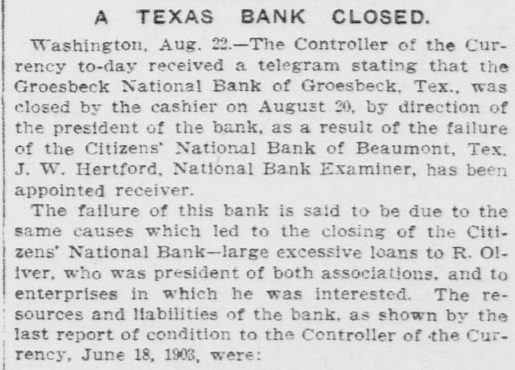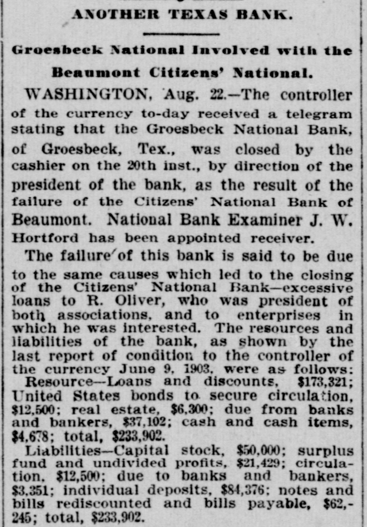 ANOTHER TEXAS BANK. Groesbeck National Involved with the Beaumont Citizens' National. WASHINGTON, Aug. 22.-The controller of the currency to-day received a telegram stating that the Groesbeck National Bank, of Groesbeck, Tex., was closed by the cashier on the 20th inst., by direction of the president of the bank, as the result of the failure of the Citizens' National Bank of Beaumont. National Bank Examiner J. W. Hortford has been appointed receiver. The failure of this bank is said to be due to the same causes which led to the closing of the Citizens' National Bank-excessive loans to R. Oliver, who was president of both associations, and to enterprises in which he was interested. The resources and liabilities of the bank, as shown by the last report of condition to the controller of the currency June 9, 1903, were as follows: Resource-Loans and discounts, $173,321; United States bonds to secure circulation, $12,500; real estate, $6,300; due from banks and bankers, $37,102; cash and cash items, $4,678; total, $233,902. Liabilities-Capital stock, $50,000; surplus fund and undivided profits, $21,429; circulation, $12,500; due to banks and bankers, $3,351; individual deposits, $84,376; notes and bills rediscounted and bills payable, $62,245; total, $233,902.