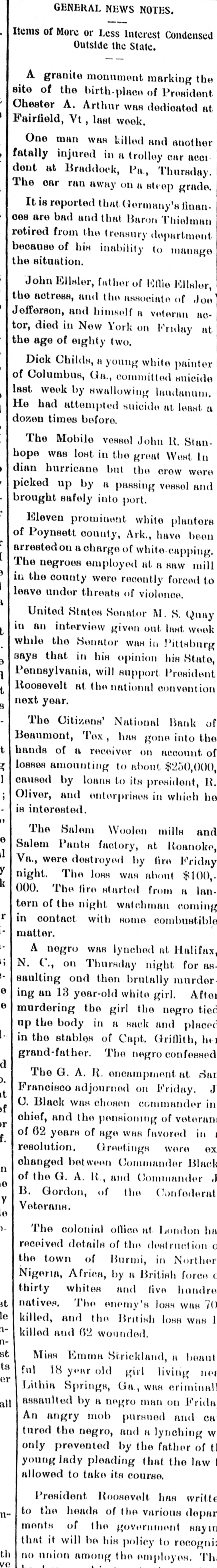 GENERAL NEWS NOTES. Items of More or Less Interest Condensed Outside the State. A granite monument marking the site of the birth-place of President Chester A. Arthur was dedicated at Fairfield, Vt, last week. One man was killed and another fatally injured in 8 trolley car acci dent at Braddock, Pa, Thursday. The car ran away on 8 steep grade. It is reported that Germany's finances are bad and that Baron Thielman retired from the treasury department because of his inability to manage the situation. John Ellster, father of Effie Ellsler, the actress, and the associate of Joe Jefferson, and himself 8 veteran actor, died in New York on Friday at the age of eighty two. Dick Childs, 8 young white painter of Columbus, Ga., committed suicide last week by swallowing landanum. He had attempted suicide at least a dozen times before. The Mobile vessol John R. Stanhope was lost in the great West In dian burricane but the crow were picked up by 8 passing vessel and brought safely into port. Eleven prominent white planters of Poynsett county, Ark., have been arrested on 8 charge of white-capping The negroes employed at 8 HBW mill in the county were recently forced to leave under threats of violence. United States Senator M. S. Quay in an interview given out last week while the Senator was in Pittsburg says that in his opinion his State, Pennsylvania, will support President t Roosevelt at the national convention next year. 8 The Citizens' National Bank of Beaumont, Tox, has gone into the t hands of 8 receiver on account of g 108808 amounting to about $250,000, I caused by loans to its president, R. ; Oliver, and enterprises in which he is interested. e The Salem Woolen mills and 1 Salem Pants factory, at Roanoke, y Va., were destroyed by fire Friday k night. The loan was about $100, 000. The fire started from 11 lanr tern of the night watchman coming in contact with some combustible matter. ; A negro was lynched at Halifax N. C., on Thursday night for 88 e saulting ond then brutally murder e ing an 13 year-old white girl. After murdering the girl the negro tied up the body in 8 sack and placed in the stables of Capt. Griflith, he d grand-father. The negro confessed b. The G. A. R. encampment at Bar J t Francisco adjourned on Friday. of C. Black was chosen commander in r chief, and the pensioning of veteran f. of 62 years of age was favored in resolution. Greetings were ex In changed bet ween Commander Black e of the G. A. R., and Commander J B. Gordon, of the Confederat y Veterans. e , The colonial office at London ha received details of the destruction o the town of Burmi, in Norther Nigeria, Africa, by 11 British force thirty whites and five hondre at natives. The enemy's loss W88 70 le 1 nkilled, and the British loss was killed and 62 wounded. nst ts Miss Emma Strickland, 8 beaut ful er 18 year old girl living net Lithia Springs, Ga, W88 criminal all assaulted by 8 negro man on Frida An angry mob pursued and CA tured the negro, and 11 lynching W only prevented by the father of tl young lady pleading that the law allowed to take its course. President Roosevelt has writte to nthe heads of the various depar ments of the government sayin that it will be his policy to recogniz th Th ve no union among the employes.