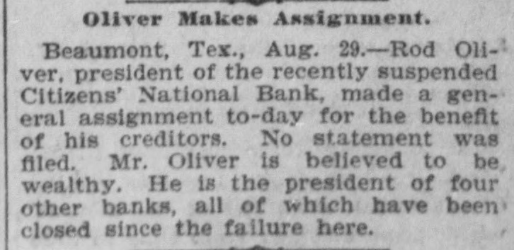 Oliver Makes Assignment. Beaumont, Tex., Aug. 29.-Rod Oliver, president of the recently suspended Citizens' National Bank, made a general assignment to-day for the benefit of his creditors. No statement was filed. Mr. Oliver is believed to be wealthy. He is the president of four other banks, all of which have been closed since the failure here.