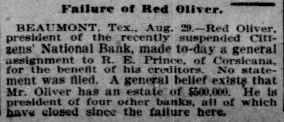 Failure of Red Oliver. BEAUMONT. Tex., Aug. 29.-Red Oliver, president of the recently suspended Citizens' National Bank, made to-day a general assignment to R. E. Prince, of Corsicana, for the benefit of his creditors. No statement was filed. A general belief exists that Mr. Oliver has an estate of $500,000. He is president of four other banks, all of which have closed since the failure here.