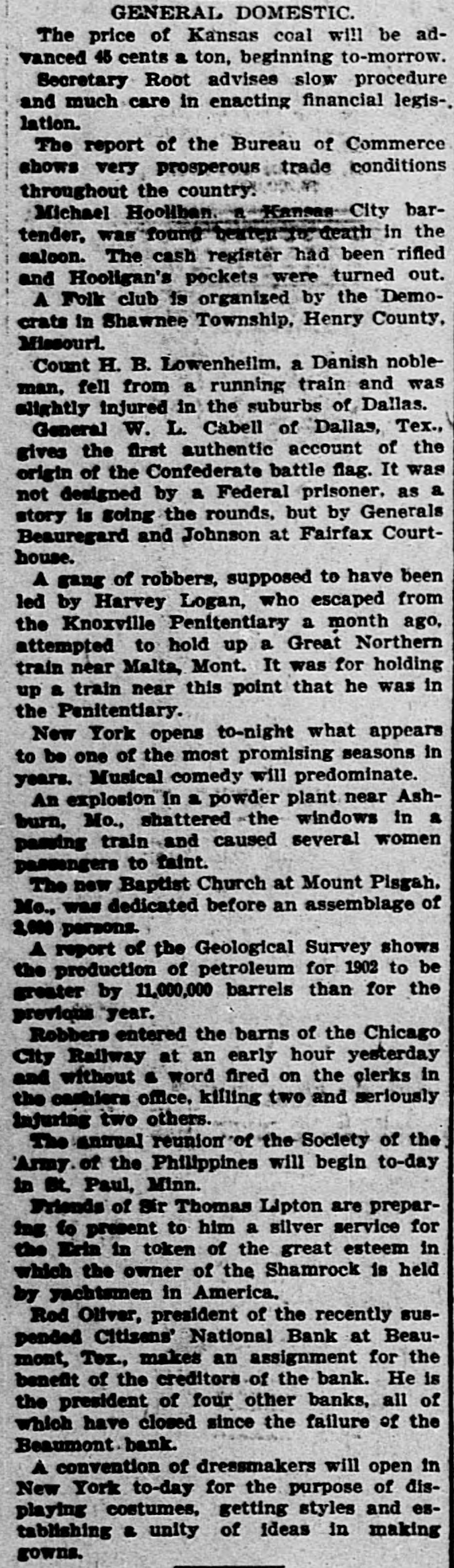 GENERAL DOMESTIC. The price of Kansas coal will be advanced 45 cents a ton, beginning to-morrow. Secretary Root advises slow procedure and much care in enacting financial legis-, lation. The report of the Bureau of Commerce shows very prosperous trade conditions throughout the country. Michael Hooliban a Kansas City bartender, was found beaten 100 death in the saloon. The cash register had been rifled and Hooligan's pockets were turned out. A Folk club is organized by the Democrats in Shawnee Township, Henry County, Missouri. Count H. B. Lowenheilm. a Danish nobleman, fell from a running train and was slightly injured in the suburbs of Dallas. General W. L. Cabell of Dallas, Tex., gives the first authentic account of the origin of the Confederate battle flag. It was not designed by a Federal prisoner. as a story is going the rounds, but by Generals Beauregard and Johnson at Fairfax Courthouse. A gang of robbers, supposed to have been led by Harvey Logan, who escaped from the Knoxville Penitentiary a month ago, attempted to hold up a Great Northern train near Malta, Mont. It was for holding up a train near this point that he was in the Penitentiary. New York opens to-night what appears to be one of the most promising seasons in years. Musical comedy will predominate. An explosion In a powder plant near Ashburn, Mo., shattered the windows in a passing train and caused several women passengers to faint. The new Baptist Church at Mount Pisgah. Mo., was dedicated before an assemblage of 2,000 persons. A report of the Geological Survey shows the production of petroleum for 1902 to be greater by 11,000,000 barrels than for the previous year. Robbers entered the barns of the Chicago City Railway at an early hour yesterday and without a word fired on the clerks in the cashiers office, killing two and seriously injuring two others. The antrual reunion of the Society of the Army. of the Philippines will begin to-day in Bt. Paul, Minn. Friends of Sir Thomas Lipton are preparing to present to him a silver service for the Erin in token of the great esteem in which the owner of the Shamrock is held by yachtsmen in America. Rod Oliver, president of the recently suspended Citizens' National Bank at Beaumont, Tex., makes an assignment for the benefit of the creditors of the bank. He is the president of four other banks, all of which have closed since the failure of the Beaumont bank. À convention of dressmakers will open in New York to-day for the purpose of displaying costumes, getting styles and establishing & unity of ideas in making gowns.