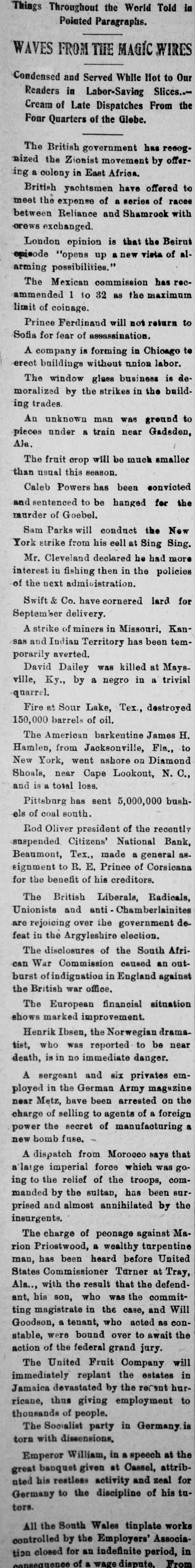 Throughout the World Told in Pointed Paragraphs. WAVES FROM THE MAGIC WIRES Condensed and Served While Hot to Our Readers in Labor-Saving Slices.-Cream of Late Dispatches From the Four Quarters of the Globe. The British government has recognized the Zionist movement by offering a colony in East Africa. British yachtsmen have offered to meet the expense of a series of races between Reliance and Shamrock with crews exchanged. London opinion is that the Beirut epicode "opens up a new vista of alarming possibilities." The Mexican commission has recammended 1 to 32 as the maximum limit of coinage. Prince Ferdinand will not return to Sofia for fear of assassination. A company is forming in Chicago te erect buildings without union labor. The window glass business is demoralized by the strikes in the building trades. An unknown man was ground to pieces under a train near Gadsden, Ala. The fruit crop will be much smaller than usual this season. Caleb Powers has been convicted and sentenced to be hanged for the murder of Goebel. Sam Parks will conduct the New York strike from his cell at Sing Sing. Mr. Cleveland declared he had more interest in fishing then in the policies of the next administration. Swift & Co. have cornered lard for September delivery. A strike of miners in Missouri, Kansas and Indian Territory has been temporarily averted. David Dailey was killed at Maysville, Ky., by a negro in a trivial quarrel. Fire at Sour Lake, Tex., destroyed 150,000 barrels of oil. The American barkentine James H. Hamlen, from Jacksonville, Fla., to New York, went ashore on Diamond Shoals, near Cape Lookout, N. C., and is a total loss. Pittsburg has sent 5,000,000 bushels of coal south. Rod Oliver president of the recently suspended Citizens' National Bank, Beaumont, Tex., made a general assignment to R. E. Prince of Corsicana for the benefit of his creditors. The British Liberals, Radicals, Unionists and anti Chamberlainites are rejoicing over the government defeat in the Argyleshire election. The disclosures of the South African War Commission caused an outburst of indignation in England against the British war office. The European financial situation shows marked improvement. Henrik Ibsen, the Norwegian dramatist, who was reported to be near death, is in no immediate danger. A sergeant and six privates employed in the German Army magazine near Metz, have been arrested on the charge of selling to agents of a foreign power the secret of manufacturing a new bomb fuse. A dispatch from Moroceo says that alaige imperial force which was going to the relief of the troops, commanded by the sultan, has been surprised and almost annihilated by the insurgents. The charge of peonage against Marion Priostwood, a wealthy turpentine man, has been heard before United States Commissioner Turner at Tray, Ala.., with the result that the defendant, his son, who was the committing magistrate in the case, and Will Goodson, a tenant, who acted as constable, were bound over to await the action of the federal grand jury. The United Fruit Company will immediately replant the estates in Jamaica devastated by the recent hurricane, thus giving employment to thousands of people. The Socialist party in Germany is torn with dissensions, Emperor William, in a speech at the great banquet given at Cassel, attribnted his restless activity and zeal for Germany to the discipline of his tu-