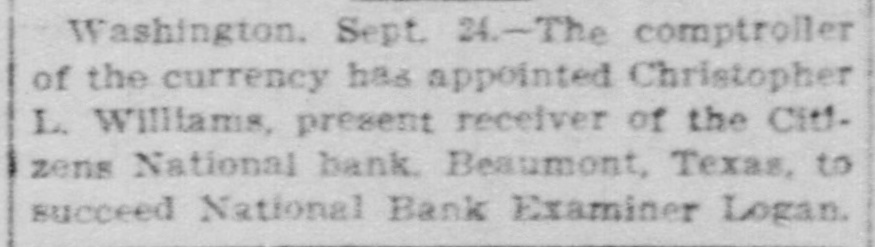 Washington. Sept. 24.-The comptroller of the currency has appointed Christopher L. Williams, present receiver of the Citizens National bank. Beaumont, Texas, to succeed National Bank Examiner Logan.
