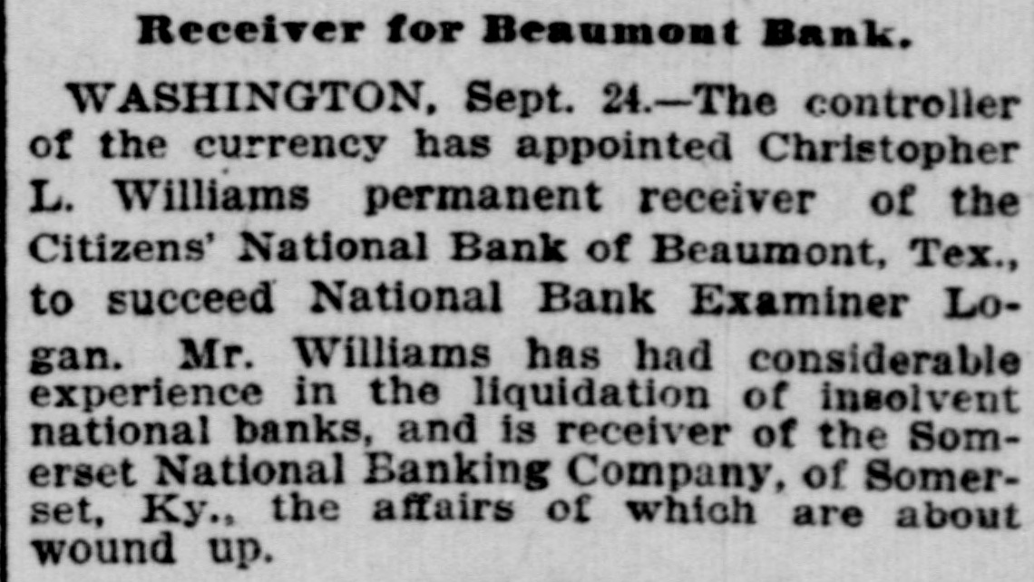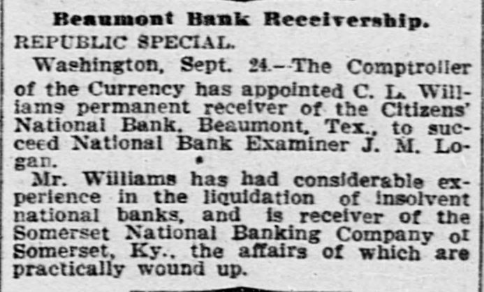Beaumont Bank Receivership. REPUBLIC SPECIAL. Washington, Sept. 24.-The Comptroller of the Currency has appointed C. L. Williams permanent receiver of the Citizens' National Bank. Beaumont, Tex., to succeed National Bank Examiner J. M. Logan. Mr. Williams has had considerable experience in the liquidation of insolvent national banks, and is receiver of the Somerset National Banking Company of Somerset, Ky., the affairs of which are practically wound up.