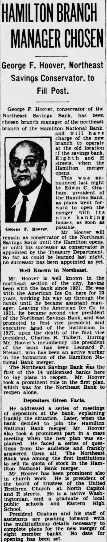 BRANCH MANAGER CHOSEN George F. Hoover, Northeast Savings Conservator, to Fill Post. George conservator of the Northeast Savings has chosen manager branch of the Hamilton National charge branch operate old the Hamilton merger This nounced last Grapresident the plans went ward open merger soon George Hoover will remain as conservator the his the Treasury Department. So far could learned no successor been appointed as yet. Well Known in Northeast. Mr. Hoover well known having the He with the American Ice Co. for working through the ranks until the Ice second vice president and promoted first vice president and executive head the institution the first Charles During Mr. the president the has been Leonard has the of the Hamilton NaThe Savings Bank was the first the 14 banks lay plans reopen. Mr Hoover took prominent the first which was for the Northeast Bank reopen alone Depositors Given Facts. He addressed series of meetings of depositors the bank. explaining frankly Later, when bank decided to join Hamilton Mr. Hoover also meeting the was He faced series questions from audience frankly answered Northeast Bank the first to the HamNational Hoover has also church president the board of trustees the United Brethren North Capitol He is Washpublic schools Eastern High School. President Graham and his staff the plans for the new merger eight No date for opening has been set.