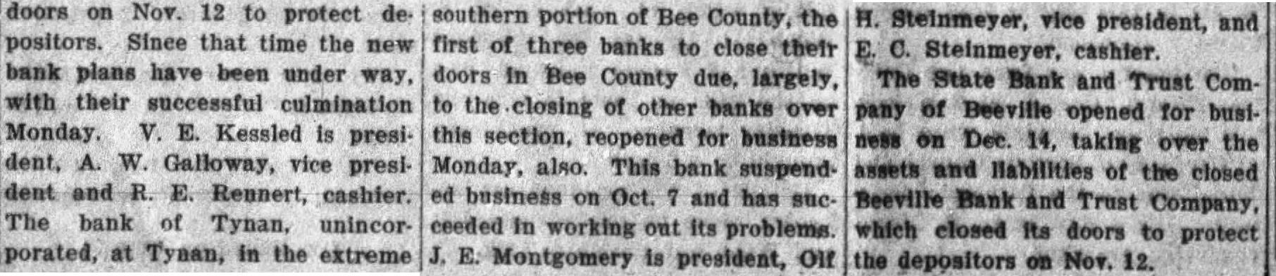 doors on Nov. 12 to protect depositors. Since that time the new bank plans have been under way, with their successful culmination Monday. V. E. Kessled is president. Galloway, vice president and Rennert, cashier. The bank of unincorporated, at Tynan, in the extreme southern portion of Bee County, the first of three banks to doors in Bee County due, largely, to the closing of other banks over this section, reopened for business Monday, also. This bank suspended business Oct. and has succeeded in working out its E. Montgomery is president, Off Steinmeyer, vice president, and Steinmeyer, cashier. The State Bank and Trust Company of Beeville opened for business on Dec. 14. taking over the assets and llabilities of the closed Beeville Bank and Trust Company, which closed its doors to protect the depositors on Nov. 12.