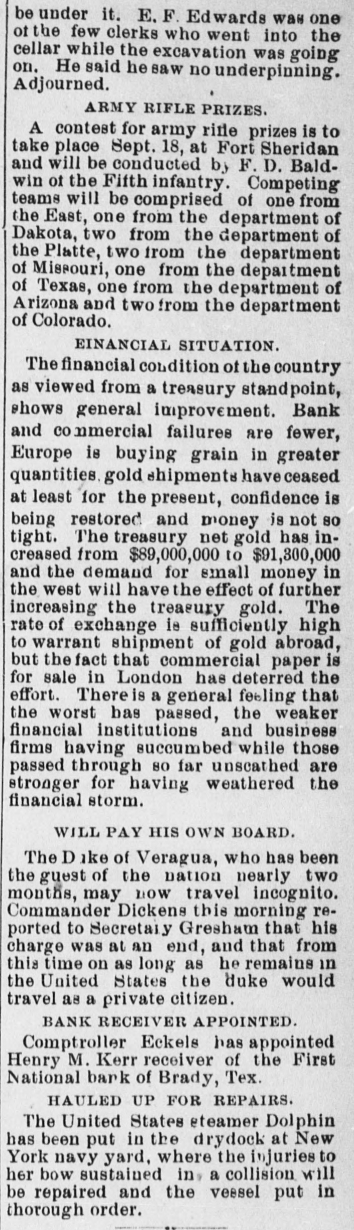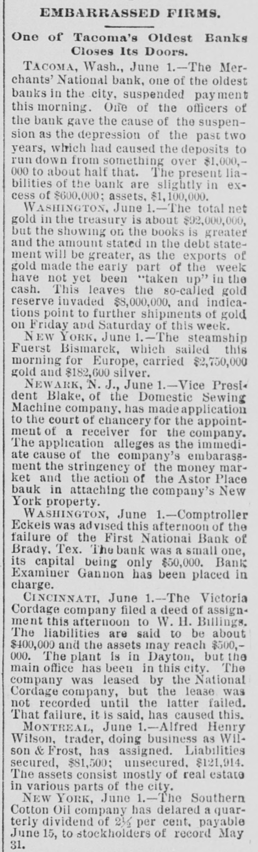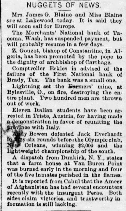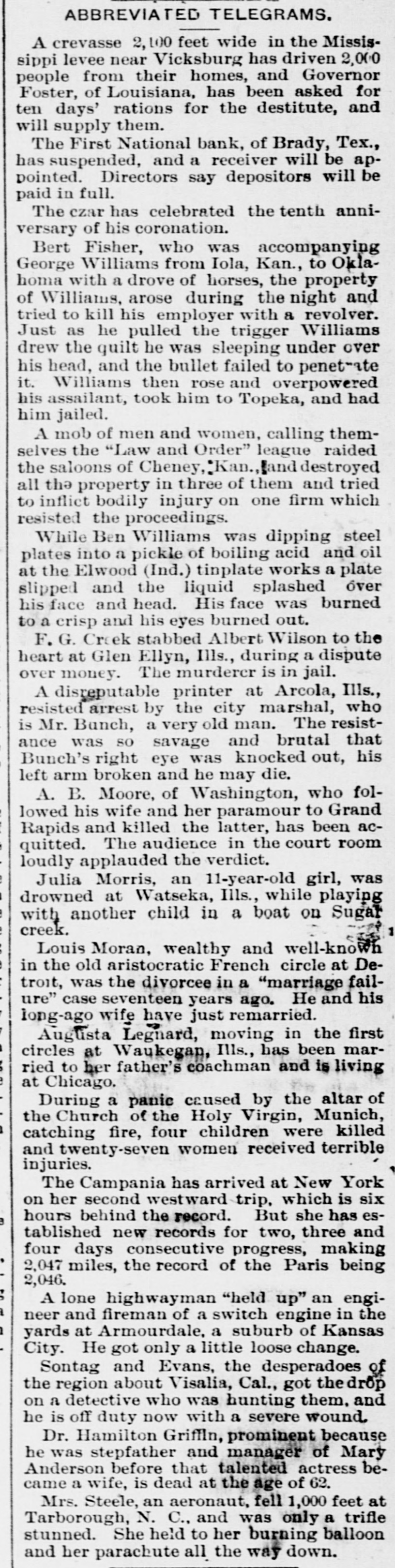 ABBREVIATED TELEGRAMS. A crevasse 2,100 feet wide in the Mississippi levee near Vicksburg has driven 2,000 people from their homes, and Governor Foster, of Louisiana, has been asked for ten days' rations for the destitute, and will supply them. The First National bank, of Brady, Tex., has suspended, and a receiver will be appointed. Directors say depositors will be paid in full. The ezar has celebrated the tenth anniversary of his coronation. Bert Fisher, who was accompanying George Williams from Iola, Kan., to Oklahoma with a drove of horses, the property of Williams, arose during the night and tried to kill his employer with a revolver. Just as he pulled the trigger Williams drew the quilt he was sleeping under over his head, and the bullet failed to penetrate it. Williams then rose and overpowered his assailant, took him to Topeka, and had him jailed. A mob of men and women, calling themselves the "Law and Order" league raided the saloons of Cheney, Kan. and destroyed all the property in three of them and tried to inflict bodily injury on one firm which resisted the proceedings. While Ben Williams was dipping steel plates into a pickle of boiling acid and oil at the Elwood (Ind.) tinplate works a plate slipped and the liquid splashed over his face and head. His face was burned to a crisp and his eyes burned out. G. Creek stabbed Albert Wilson to the heart at Glen Ellyn, Ills., during a dispute over money. The murderer is in jail. A disreputable printer at Arcola, Ills., resisted arrest by the city marshal, who is Mr. Bunch, a very old man. The resistance was SO savage and brutal that Bunch's right eye was knocked out, his left arm broken and he may die. A. B. Moore, of Washington, who followed his wife and her paramour to Grand Rapids and killed the latter, has been acquitted. The audience in the court room loudly applauded the verdict. Julia Morris, an 11-year-old girl, was drowned at Watseka, Ills., while playing with another child in a boat on Sugar creek. Louis Moran, wealthy and well-known in the old aristocratic French circle at Detroit, was the divorcee in a "marriage failure" case seventeen years ago. He and his long-ago wife have just remarried. Augusta Legnard, moving in the first circles at Waukegan, Ills., has been married to her father's coachman and is living at Chicago. During a panic caused by the altar of the Church of the Holy Virgin, Munich, catching fire, four children were killed and twenty-seven women received terrible injuries. The Campania has arrived at New York on her second westward trip, which is six hours behind the record. But she has established new records for two, three and four days consecutive progress, making 2,047 miles, the record of the Paris being 2,046. A lone highwayman "held up" an engineer and fireman of a switch engine in the h yards at Armourdale, a suburb of Kansas City. He got only a little loose change. Sontag and Evans, the desperadoes of the region about Visalia, Cal., got the drop on a detective who was hunting them. and he is off duty now with a severe wound. Dr. Hamilton Griffln, prominent because he was stepfather and manager of Mary Anderson before that talented actress became a wife, is dead at the age of 62. Mrs. Steele, an aeronaut, fell 1,000 feet at Tarborough, N. C., and was only a trifle stunned. She held to her burning balloon and her parachute all the way down.