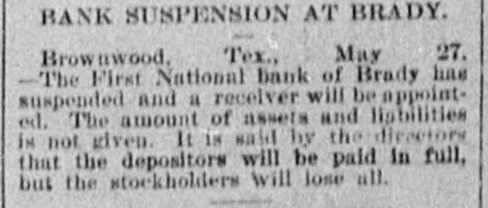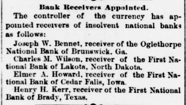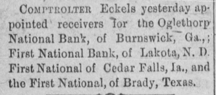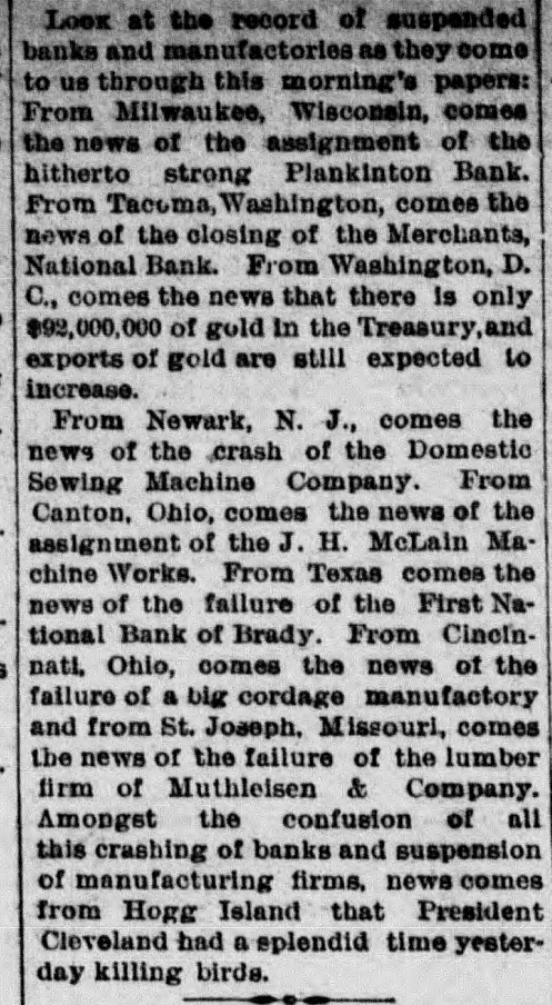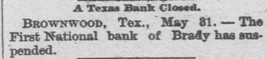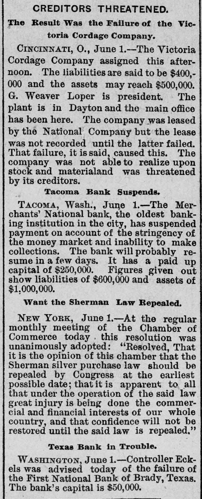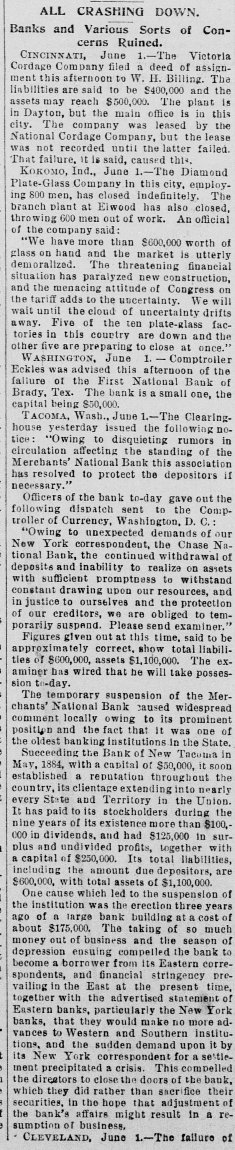 ABBREVIATED TELEGRAMS. A crevasse 2,100 feet wide in the Mississippi levee near Vicksburg has driven 2,000 people from their homes, and Governor Foster, of Louisiana, has been asked for ten days' rations for the destitute, and will supply them. The First National bank, of Brady, Tex., has suspended, and a receiver will be appointed. Directors say depositors will be paid in full. The ezar has celebrated the tenth anniversary of his coronation. Bert Fisher, who was accompanying George Williams from Iola, Kan., to Oklahoma with a drove of horses, the property of Williams, arose during the night and tried to kill his employer with a revolver. Just as he pulled the trigger Williams drew the quilt he was sleeping under over his head, and the bullet failed to penetrate it. Williams then rose and overpowered his assailant, took him to Topeka, and had him jailed. A mob of men and women, calling themselves the "Law and Order" league raided the saloons of Cheney, Kan. and destroyed all the property in three of them and tried to inflict bodily injury on one firm which resisted the proceedings. While Ben Williams was dipping steel plates into a pickle of boiling acid and oil at the Elwood (Ind.) tinplate works a plate slipped and the liquid splashed over his face and head. His face was burned to a crisp and his eyes burned out. G. Creek stabbed Albert Wilson to the heart at Glen Ellyn, Ills., during a dispute over money. The murderer is in jail. A disreputable printer at Arcola, Ills., resisted arrest by the city marshal, who is Mr. Bunch, a very old man. The resistance was SO savage and brutal that Bunch's right eye was knocked out, his left arm broken and he may die. A. B. Moore, of Washington, who followed his wife and her paramour to Grand Rapids and killed the latter, has been acquitted. The audience in the court room loudly applauded the verdict. Julia Morris, an 11-year-old girl, was drowned at Watseka, Ills., while playing with another child in a boat on Sugar creek. Louis Moran, wealthy and well-known in the old aristocratic French circle at Detroit, was the divorcee in a "marriage failure" case seventeen years ago. He and his long-ago wife have just remarried. Augusta Legnard, moving in the first circles at Waukegan, Ills., has been married to her father's coachman and is living at Chicago. During a panic caused by the altar of the Church of the Holy Virgin, Munich, catching fire, four children were killed and twenty-seven women received terrible injuries. The Campania has arrived at New York on her second westward trip, which is six hours behind the record. But she has established new records for two, three and four days consecutive progress, making 2,047 miles, the record of the Paris being 2,046. A lone highwayman "held up" an engineer and fireman of a switch engine in the h yards at Armourdale, a suburb of Kansas City. He got only a little loose change. Sontag and Evans, the desperadoes of the region about Visalia, Cal., got the drop on a detective who was hunting them. and he is off duty now with a severe wound. Dr. Hamilton Griffln, prominent because he was stepfather and manager of Mary Anderson before that talented actress became a wife, is dead at the age of 62. Mrs. Steele, an aeronaut, fell 1,000 feet at Tarborough, N. C., and was only a trifle stunned. She held to her burning balloon and her parachute all the way down.