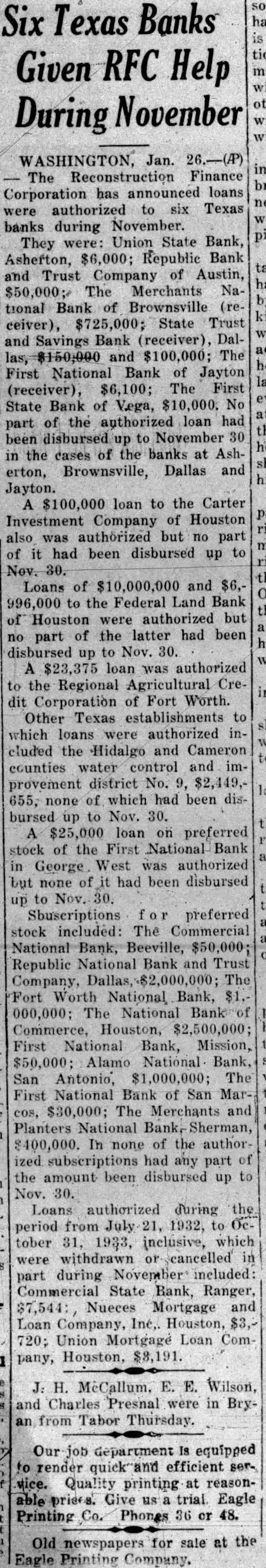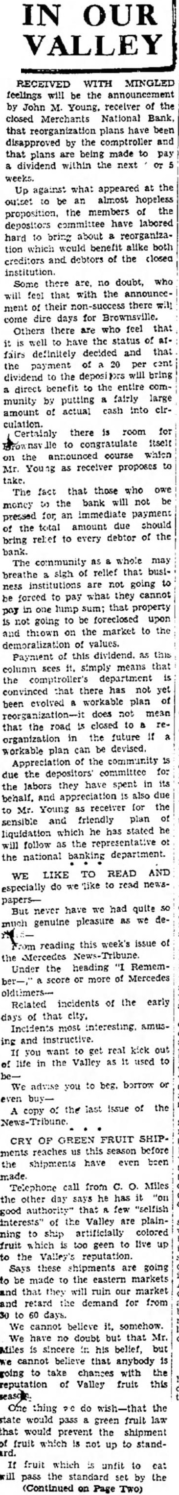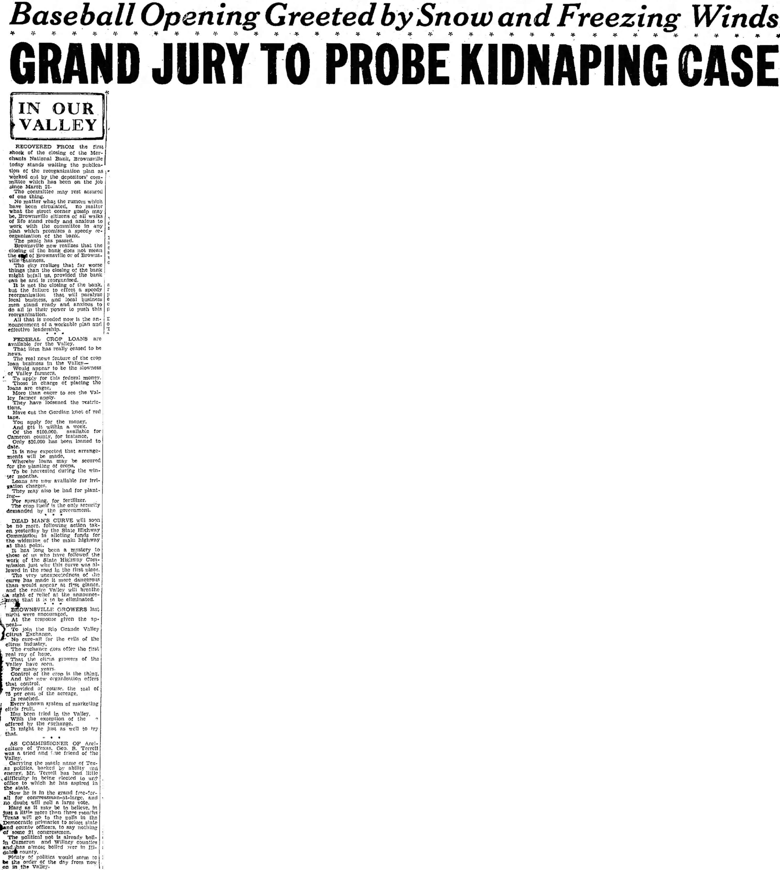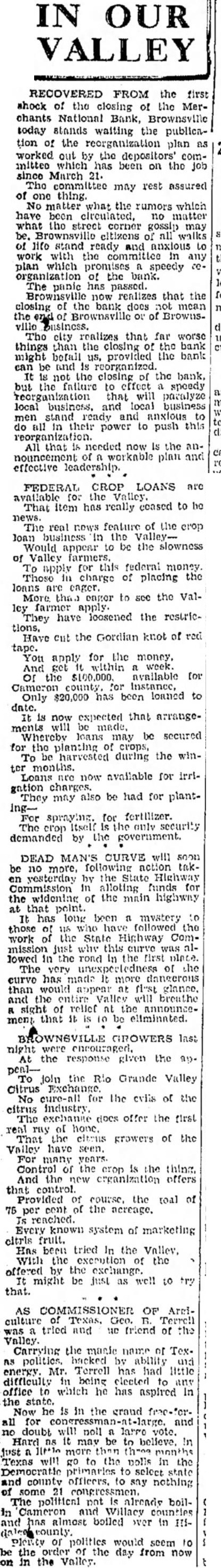 Opening Greeted by Freezing Winds GRAND JURY TO PROBE KIDNAPING CASE IN VALLEY RECOVERED FROM the first shock of the closing of the Merchants National Bank, Brownsville today stands waiting the publication of the reorganization plan worked out by the depositors' committee which has been on the job since March 21. The committee may rest assured one thing. No matter what the rumors which have been circulated, matter what the street corner gossip may citizens of all walks life stand ready and anxious work with the committee plan which promises specdy organization the bank. The panic has passed. Brownsville now realizes that the closing of the bank docs mean the Brownsville or of Brownsbusiness. The city realizes that far worse things than the closing the bank might befall us. provided the bank and reorganized. not the closing of the bank, but the failure effect speedy that will paralyze local business, and local business stand ready and anxious to all in their power to push this All that is needed now is the anof workable plan and effective leadership. FEDERAL CROP LOANS are the That item has really ceased to be news. The real news feature of the crop loan business the Would appear to be the slowness Valley To for this federal money Those charge of placing the loans are More than eager to SCO the Valfarmer apply. They have loosened the restricHave cut the Gordian knot of red tape. You apply for the money, And within the available for Cameron for instance, Only $20,000 has been loaned to now expected that arrangements will Whereby may be secured for the planting crops, To be harvested during the winmonths. now available for Loans gation charges. They may also be bad for plantspraying. for fertilizer. The the only security demanded the government. DEAD MAN'S CURVE will following action takno more. by the State Highway Commission alloting funds the widening of the main highway that point. has long been mystery to those who have followed the work the State Highway Commission just why this curve was allowed in the road In flrst place. The very unexpectedness of the curve has made dancerous than would appear nt flrst and the Valley breathe sight relief the announcethat be eliminated. GROWERS last night the response given the join the Rio Grande Valley Exchange. No for the evils of the citrus exchange does offer the first of hope. ray the growers of the have seen. For Control of crop is the thing. And the organization offers that Provided of course. the of per cent the acreage. reached. Every known system of marketing fruit. Has been tried In the Valley. With the exception the offered the exchange. might be Just as well to try that. AS OF Arelculture Geo. tried and friend the Valley. Carrying the masle name of Texpolitics. backed ability energy. Mr. Terrell has had little difficulty being elected to office which he has aspired in the state. Now he in the grand for and doubt will poll large vote. Hard as may be to believe. in more than three months Texas will to the polls the Democratic select state officers, to say nothing some political not already bolland almost over in politics would seem the the day from now in the Valley.