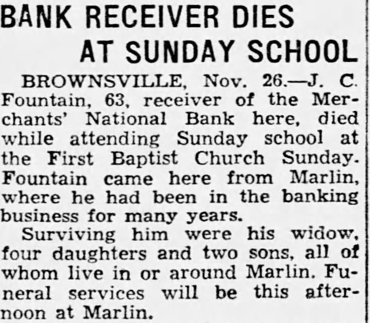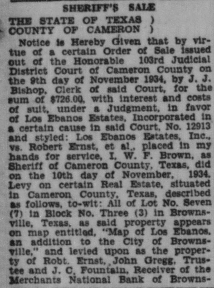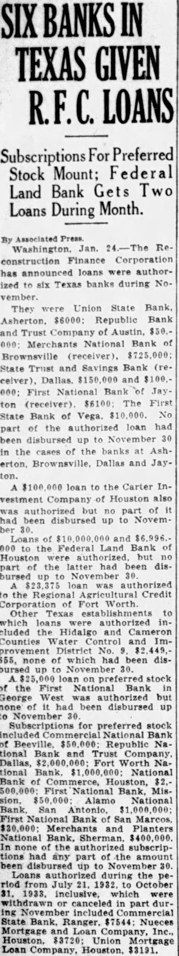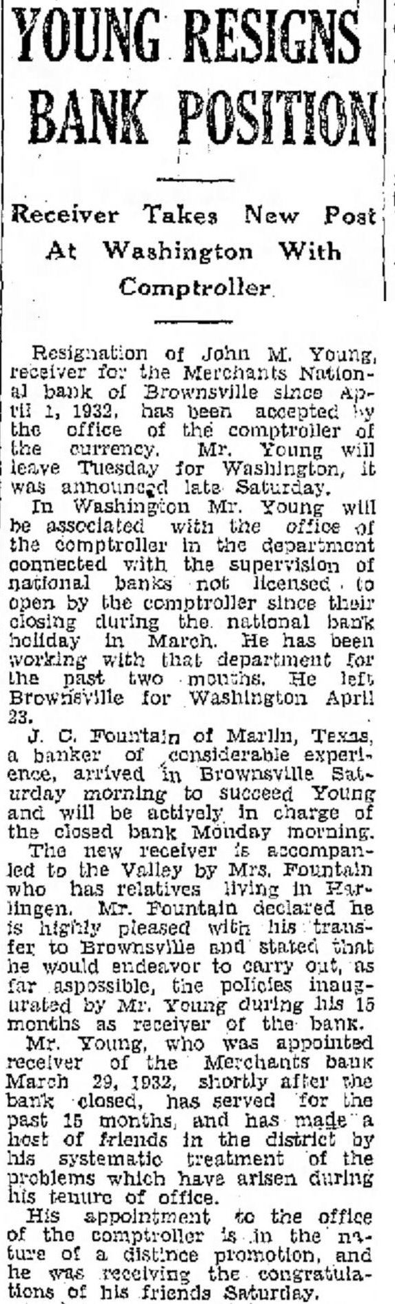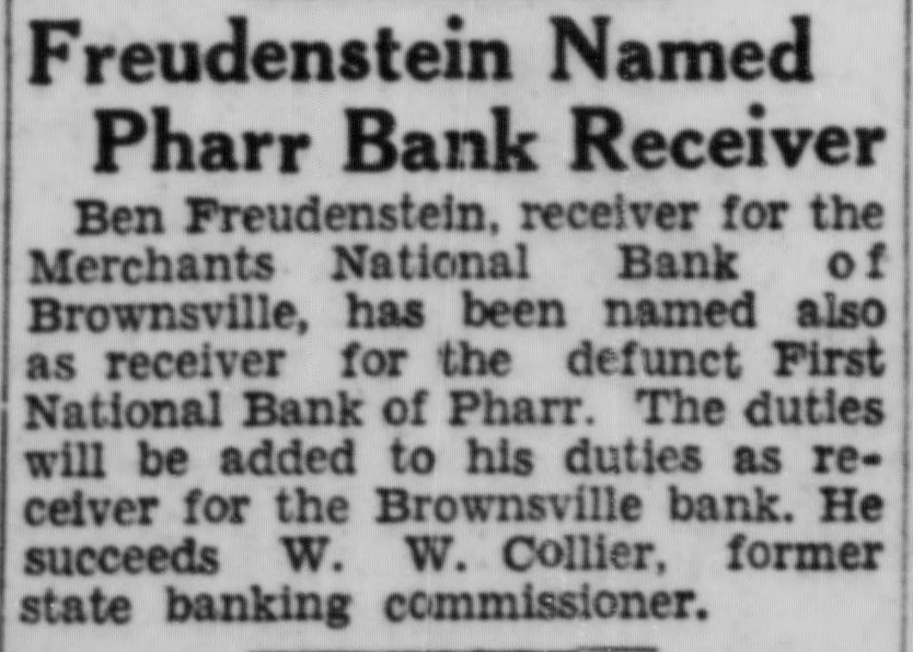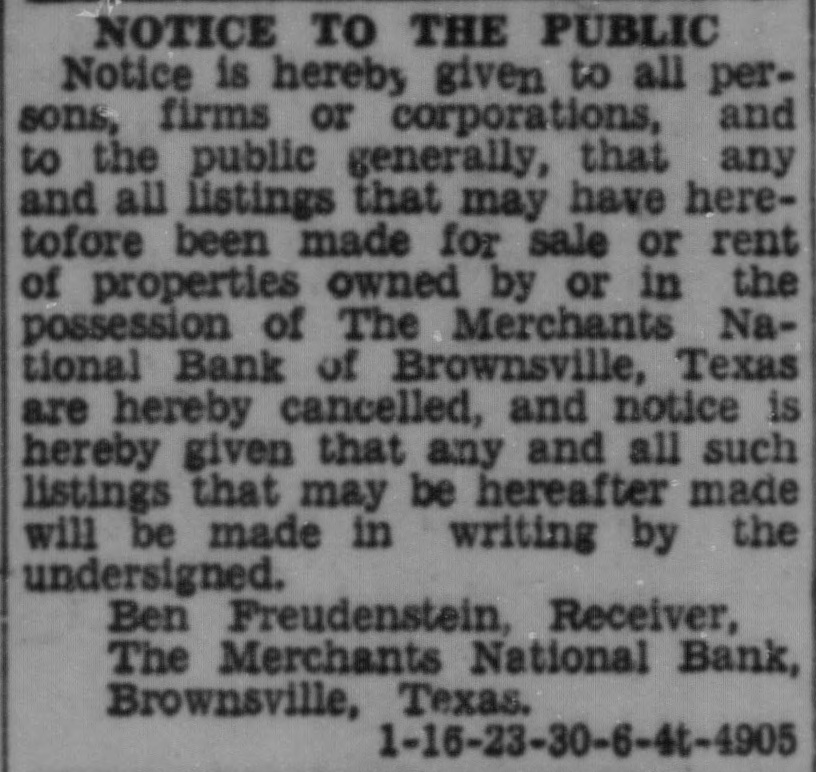Opening Greeted by Freezing Winds GRAND JURY TO PROBE KIDNAPING CASE IN VALLEY RECOVERED FROM the first shock of the closing of the Merchants National Bank, Brownsville today stands waiting the publication of the reorganization plan worked out by the depositors' committee which has been on the job since March 21. The committee may rest assured one thing. No matter what the rumors which have been circulated, matter what the street corner gossip may citizens of all walks life stand ready and anxious work with the committee plan which promises specdy organization the bank. The panic has passed. Brownsville now realizes that the closing of the bank docs mean the Brownsville or of Brownsbusiness. The city realizes that far worse things than the closing the bank might befall us. provided the bank and reorganized. not the closing of the bank, but the failure effect speedy that will paralyze local business, and local business stand ready and anxious to all in their power to push this All that is needed now is the anof workable plan and effective leadership. FEDERAL CROP LOANS are the That item has really ceased to be news. The real news feature of the crop loan business the Would appear to be the slowness Valley To for this federal money Those charge of placing the loans are More than eager to SCO the Valfarmer apply. They have loosened the restricHave cut the Gordian knot of red tape. You apply for the money, And within the available for Cameron for instance, Only $20,000 has been loaned to now expected that arrangements will Whereby may be secured for the planting crops, To be harvested during the winmonths. now available for Loans gation charges. They may also be bad for plantspraying. for fertilizer. The the only security demanded the government. DEAD MAN'S CURVE will following action takno more. by the State Highway Commission alloting funds the widening of the main highway that point. has long been mystery to those who have followed the work the State Highway Commission just why this curve was allowed in the road In flrst place. The very unexpectedness of the curve has made dancerous than would appear nt flrst and the Valley breathe sight relief the announcethat be eliminated. GROWERS last night the response given the join the Rio Grande Valley Exchange. No for the evils of the citrus exchange does offer the first of hope. ray the growers of the have seen. For Control of crop is the thing. And the organization offers that Provided of course. the of per cent the acreage. reached. Every known system of marketing fruit. Has been tried In the Valley. With the exception the offered the exchange. might be Just as well to try that. AS OF Arelculture Geo. tried and friend the Valley. Carrying the masle name of Texpolitics. backed ability energy. Mr. Terrell has had little difficulty being elected to office which he has aspired in the state. Now he in the grand for and doubt will poll large vote. Hard as may be to believe. in more than three months Texas will to the polls the Democratic select state officers, to say nothing some political not already bolland almost over in politics would seem the the day from now in the Valley.
