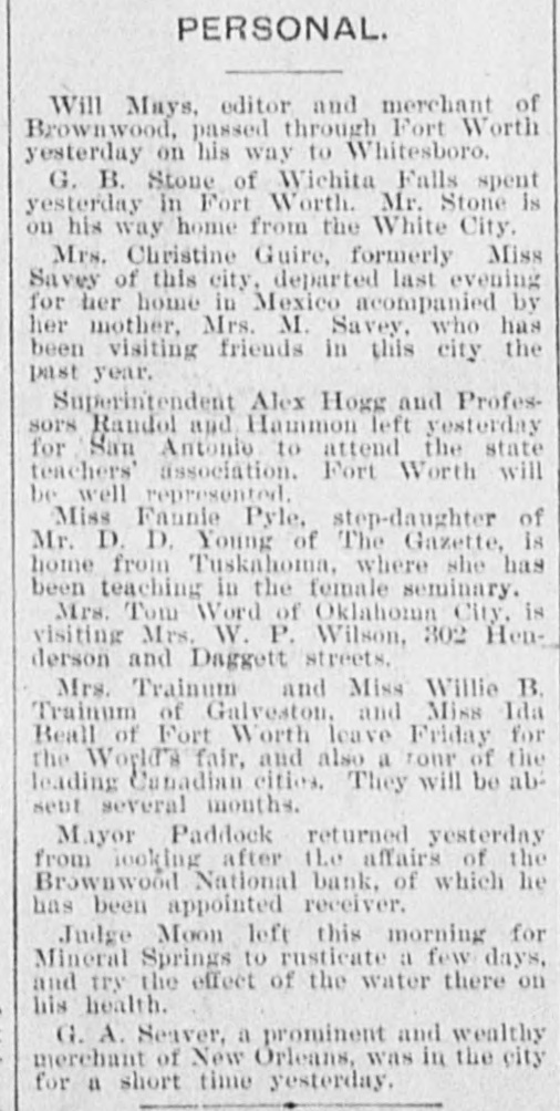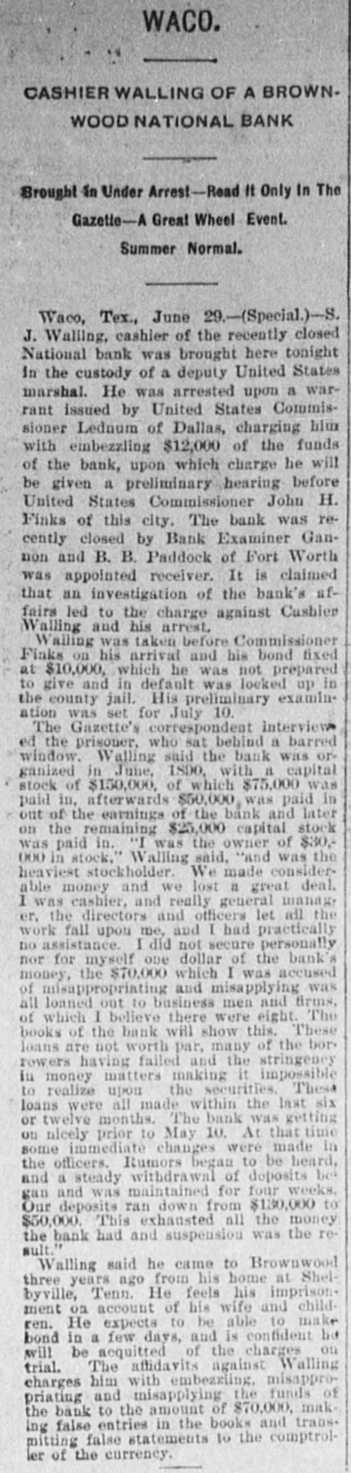 WACO. CASHIER WALLING OF A BROWNWOOD NATIONAL BANK Brought in Under Arrest-Read It Only In The Gazette-A Great Wheel Event. Summer Normal. Waco, Tex., June 29.-(Special).-S. J. Walling, cashier of the recently closed National bank was brought here tonight in the custody of a deputy United States marshal. He was arrested upon a warrant issued by United States Commissioner Lednum of Dallas, charging him with embezzling $12,000 of the funds of the bank, upon which charge he will be given a preliminary hearing before United States Commissioner John H. Finks of this city. The bank was recently closed by Bank Examiner Gannon and B. B. Paddock of Fort Worth was appointed receiver. It is claimed that an investigation of the bank's affairs led to the charge against Cashier Walling and his arrest, Walling was taken before Commissioner Finks on his arrival and his bond fixed at $10,000, which he was not prepared to give and in default was locked up in the county jail. His preliminary examination was set for July 10. The Gazette's correspondent interview ed the prisoner, who sat behind a barred window. Walling said the bank was organized in June, 1800, with a capital stock of $150,000, of which $75,000 was paid in, afterwards $50,000 was paid in out of the earnings of the bank and later on the remaining $25,000 capital stock was paid in. "I was the owner of $30, 000 in stock," Walling said, and was the heaviest stockholder. We made considerable money and we lost a great deal. 1 was cashier, and really general manage er, the directors and officers let all the work fall upon me, and I had practically no assistance. I did not secure personally nor for myself one dollar of the bank's money, the $70,000 which I was accused of misappropriating and misapplying was all loaned out to business men and firms, of which I believe there were eight. The books of the bank will show this. These loans are not worth par, many of the bor rowers having failed and the stringency in money matters making it impossible to realize upon the securities. These loans were all made within the last six or twelve months. The bank was getting on nicely prior to May 10. At that time some immediate changes were made in the officers. Rumors began to be heard, and a steady withdrawal of deposits bet gan and was maintained for four weeks. Our deposits ran down from $130,000 to $50,000. This exhausted all the money the bank had and suspension was the remult." Walling said he came to Brownwood three years ago from his home at Shelbyville, Tenn. He feels his imprisonment on account of his wife and children. He expects to be able to make bond in a few days, and is confident his will be acquitted of the charges on trial. The affidavits against Walling charges him with embezzling, misappropriating and misapplying the funds of the bank to the amount of $70,000, mak ing false entries in the books and trans. mitting false statements to the comptroller of the currency