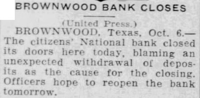 BROWNWOOD BANK CLOSES Press.) BROWNWOOD. Texas, Oct. 6.The citizens' National bank closed its doors today blaming an unexpected withdrawal of deposits as for closing. Officers hope to reopen the bank tomorrow