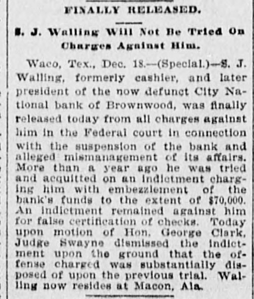# FINALLY RELEASED. S. J. Walling Will Not Be Tried On Charges Against Him. Waco, Tex., Dec. 18.-(Special.)-S. J. Walling, formerly cashier, and later president of the now defunct City National bank of Brownwood, was finally released today from all charges against him in the Federal court in connection with the suspension of the bank and alleged mismanagement of its affairs. More than a year ago he was tried and acquitted on an indictment charging him with embezzlement of the bank's funds to the extent of $70,000. An indictment remained against him for false certification of checks. Today upon motion of Hon, George Clark, Judge Swayne dismissed the indictment upon the ground that the offense charged was substantially disposed of upon the previous trial. Walling now resides at Macon, Ala.
