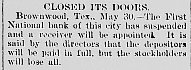 CLOSED ITS DOORS. Brownwood, Tex., May 30.-The First National bank of this city has suspended and a receiver will be appointed It is said by the directors that the depositors will be paid in full. but the stockholders will lose all.