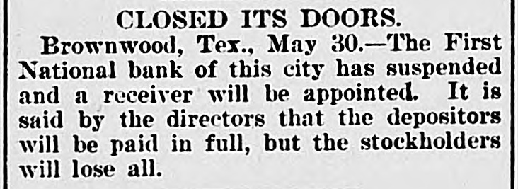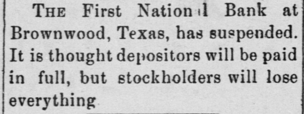THE First Nation il Bank at Brownwood, Texas, has suspended. It is thought depositors will be paid in full, but stockholders will lose everything