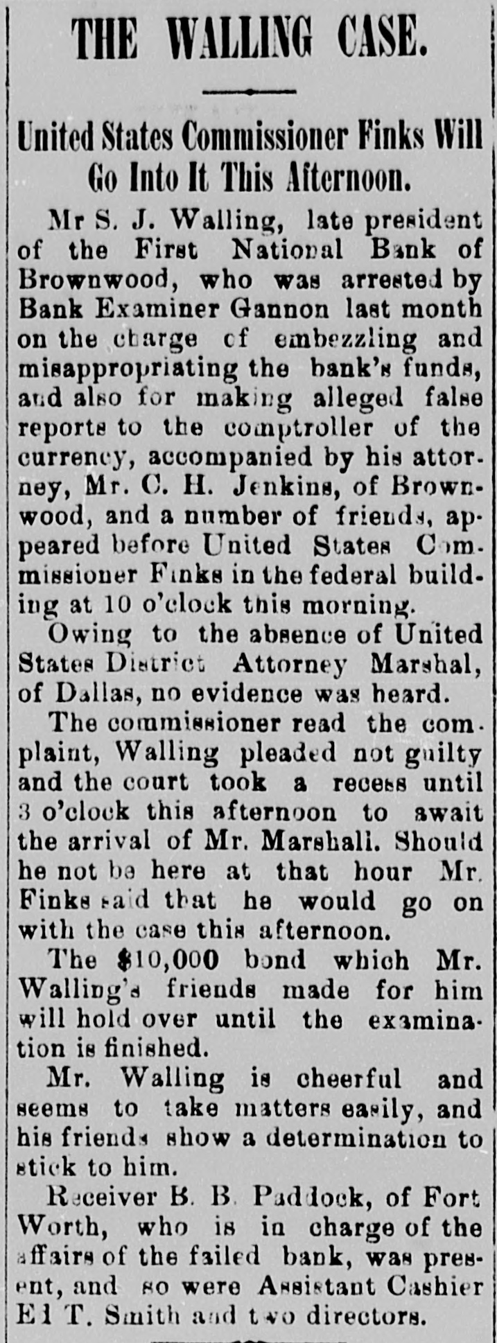 Charged With Embezzling and Making False Reports. GOT AWAY WITH ABOUT $70,000. Cashier of the First National Bank at Brownwood. S. J. Walling, Jr., late cashier of the First National bank Brownwood, was arrested at that of place yesterday on a charge of mis. and to the extent of funds appropriating embezzling *70,000 before United States Finks of this day brought mission afternoon. city committed yester- Com- bank and to He was of a to a preliminary await jail in default $10,000 examination bond Finks was arrested on a before Walling issued Commissioner July war- 10. rant by United States Com. missioner Charles Lednum of Dal las, on an affidavit made by John Gannon, bank examiner. The warrant for his arrest was issued June 27. The bank examiner made investigation of the bank's an a week ago on a about made complaint affairs by one of the stockholders. He found the condition of bank to be such that he immediately the took charge and Hon. B. B. Pad. dock receiver. of Fort Worth was appointed The warrant specifically charges Walling with misappropriating and embezzing the bank's funds, mak. ing false entries in the. books and false reports to the comptroller of the currency. Deputy United States Marshal to McCampbell brought the city on the "Katy" this northbound prisoner afternoon. train at 4:05 yesterday He was uncommunicative but the fects in the case are obtainable. Walling came to Brownwood from Shelbyville, Tennessee, about three years ago, and W38 the princi. pal organizer of and a large stockholder in the bank. He has been always highly re spected and trusted, and seemed be an energetic, conscientious to tleman, and the news of the charges gen. preferred deal against him caused a good of surprise and some excite. ment in Brownwood. He claims that the trouble caused by lending the bank's was re. sources on bad security, in the ular course of business, and states regthat the president and directors of the bank were cognizant of these transactions, although the bank officials went back on him, 80 he states, when he could not realize upon the money loaned. Walling is thirty-seven years old, has a wife and two children and is a rather prepossessing man personally, being rather tall, with light complexion, hair and last night that he ex. He stated make eyes. pacted to bond this morning, as soon as he heard from his friends. MR. WALLING TALKS. Mr. Walling made a short state. ment to a NEWS reporter at the jail this afternoon. He said that although he had suffered almost death, yet he had done nothing criminal. 'The bank," said he, "was running along smoothly in was all and were everything right. May We doing a big business in and carried a amount wool interest large the of wool paper. About this time the board of directors saw fit to discharge a number of bank officers who had the confidence the friends and this of dissatisfaction, which in on a run on the bank, which 15th of and until the 15th of when the bank out all money we had closed by the board, when aminer took charge. The board haia comference with after deliberations embezzlement, the negotiated to the which I amount loans of rested. June, "As the bank's shortage the for the lasted finally I him and prid was the caused began I ended May was and ex ar the with which am charged, are all in the bank, and