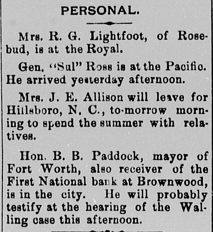 PERSONAL. Mrs. R. G. Lightfoot, of Rosebud, is at the Royal. Gen. "Sul" Ross is at the Pacifio. He arrived yeaterday afternoon. Mrs. J. E. Allison will leave for Hillsboro, N. C., to-morrow morning to spend the summer with relatives. Hon. B. B. Paddock, mayor of Fort Worth, also receiver of the First National bank at Brownwood, is in the city. He will probably testify at the hearing of the Walling case this afternoon.