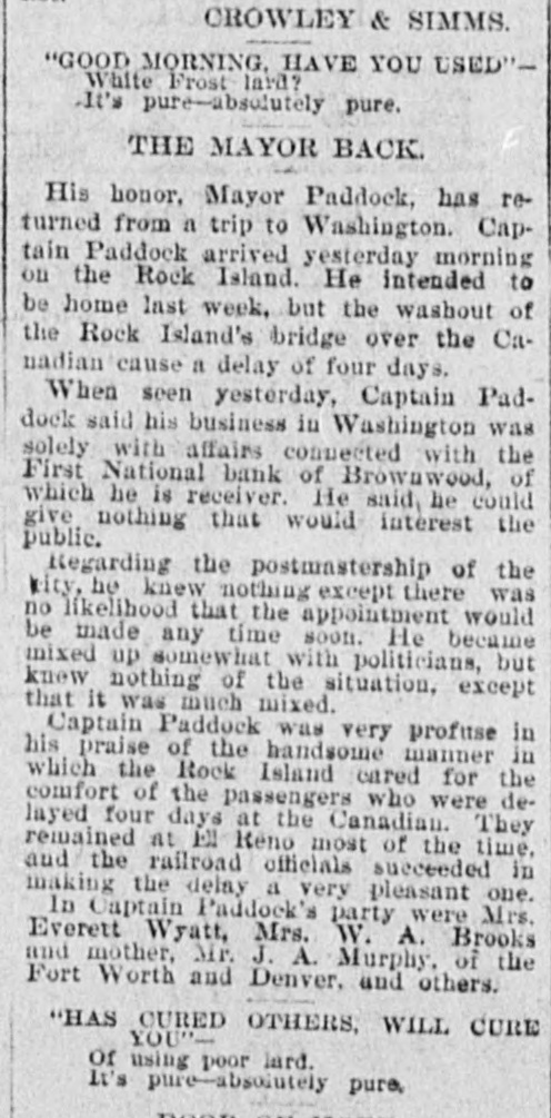 CROWLEY & SIMMS. "GOOD MORNING, HAVE YOU USED"White Frost lard? It's pure-absolutely pure. THE MAYOR BACK. His honor, Mayor Paddock, has returned from a trip to Washington. Captain Paddock arrived yesterday morning on the Rock Island. He intended to be home last week, but the washout of the Rock Island's bridge over the Canadian cause a delay of four days. When seen yesterday, Captain Paddock said his business in Washington was solely with affairs connected with the First National bank of Brownwood, of which he is receiver. He said, he could give nothing that would interest the public. Regarding the postmastership of the kity, he knew nothing except there was no likelihood that the appointment would be made any time soon. He became mixed up somewhat with politicians, but knew nothing of the situation, except that it was much mixed. Captain Paddock was very profuse in his praise of the handsome manner in which the Rock Island cared for the comfort of the passengers who were delayed four days at the Canadian. They remained at Ell Reno most of the time. and the railroad officials succeeded in making the delay a very pleasant one. In Captain Paddock's party were Mrs. Everett Wyatt, Mrs. W. A. Brooks and mother, Mr. J. A. Murphy, of the Fort Worth and Denver, and others. "HAS YOU"- CURED OTHERS, WILL CURE Of using poor lard. It's pure-absoiutely pure,