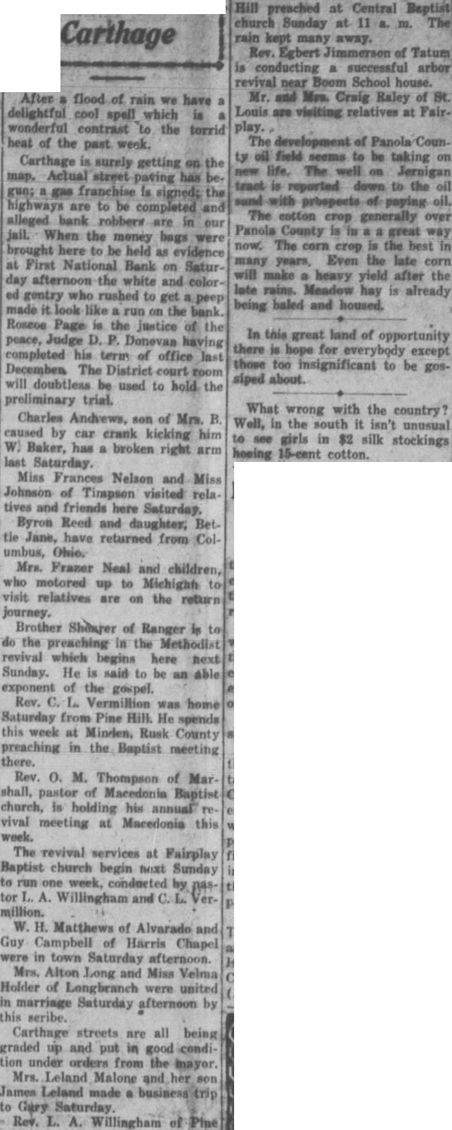 Carthage After a flood of rain we have delightful cool spell which is wonderful contrast to the torrid heat of the past week. Carthage is surely getting on the map. Actual street paving has begun; a gas franchise Is signed: the highways are to be completed and alleged. bank robbers are in our jail. When the money bags were brought here to be held as evidence at First National Bank on Saturday afternoon the white and colored gentry who rushed to get a peep made it. look like run on the bank. Roseoe Page is the justice of the peace, Judge D. P. Donovan having completed his term of office last December The District court room will doubtless be used to hold the preliminary trial. Charles Andrews, son of Mrs. B. caused by car crank kieking him W. Baker, has a broken right arm last Saturday. Miss Frances Nelson and Miss Johnson of Timpson visited relatives and friends here Saturday, Byron Reed and daughter, Bettie Jane, have returned from Columbus, Ohio. Mrs. Frazer Neal and children, who motored up to Michigan to visit relatives are on the return journey. Brother Shourer of Ranger is to do the preaching in the Methodist revival which begins here next Sunday. He is said to be an able exponent of the gospel. Rev. C. L. Vermillion was home Saturday from Pine Hill. He spends this week at Minden, Rusk County preaching in the Baptist meeting there. Rev. 0. M. Thompson of Mar shall, pastor of Macedonia Baptist church, is holding his annual revival meeting at Macedonia this week. The revival services at Fairplay Baptist church begin hext Sunday to run one week, conducted by nastor L. A. Willingham and C.L. Vermillion. W. H. Matthews of Alvarado and Guy Campbell of Harris Chapel were in town Saturday afternoon. Mrs. Alton Long and Miss Velma Holder of Longbranch were united in marriage Saturday afternoon by this seribe. Carthage streets are all being graded up and put in good condition under orders from the mayor Mrs. Leland Malone and her son James Leland made a business trip to Gary Saturday. Rev. L. A. Willingham of Pine Hill preached at Central Baptist church Sunday at 11 m. The rain kept many away. Rev. Egbert Jimmerson of Tatum is conducting a successful arbor revival near Boom School house. Mr. and Mrs. Craig Raley of St. Louis are visiting relatives at Fairplay. The development of Panola County oil field seems to be taking on new life, The well on Jernigan tract is reported down to the oil sand with prospects of paying oil. The entton crop generally over Panola County is in great way now, The corn crop is the best in many years, Even the late corn will make a heavy yield after the late rains. Meadow hay is already being baled and housed. In this great land of opportunity there is hope for everybody except those too insignificant to be gossiped about. What wrong with the country? Well, in the south it isn't unusual to see girls in $2 silk stockings heeing 15-cent cotton.