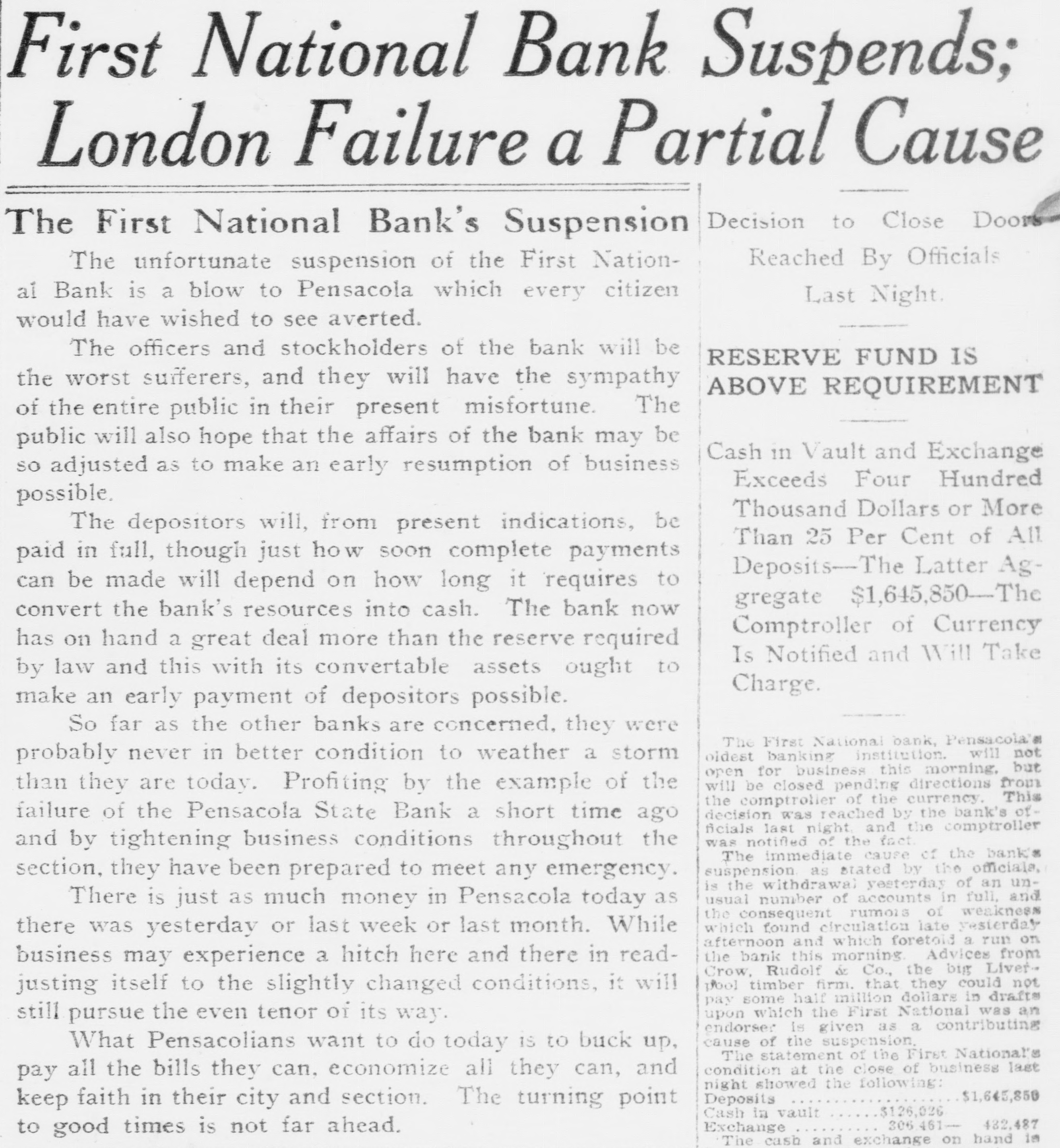 First National Bank Suspends; London Failure a Partial Cause Decision to Close Doors The First National Bank's Suspension Reached By Officials The unfortunate suspension of the First Nationai Bank is a blow to Pensacola which every citizen Last Night. would have wished to see averted. The officers and stockholders of the bank will be RESERVE FUND IS the worst sufferers, and they will have the sympathy ABOVE REQUIREMENT of the entire public in their present misfortune. The public will also hope that the affairs of the bank may be Cash in Vault and Exchange so adjusted as to make an early resumption of business Exceeds Four Hundred possible. Thousand Dollars or More The depositors will, from present indications, be Than 25 Per Cent of All paid in full, though just how soon complete payments Deposits-The Latter Agcan be made will depend on how long it `requires to gregate $1,645,850-The convert the bank's resources into cash. The bank now Comptroller of Currency has on hand a great deal more than the reserve required Is Notified and Will Take by law and this with its convertable assets ought to Charge. make an early payment of depositors possible. So far as the other banks are concerned, they were The First National bank, Pensacola's oldest banking institution. will not probably never in better condition to weather a storm open for business this morning, but will be closed pending directions from than they are today. Profiting by the example of the the comptroller of the currency. This decision was reached by the bank's offailure of the Pensacola State Bank a short time ago ficials last night and the comptroller was notified of the fact and by tightening business conditions throughout the The immediate cause of the bank's suspension. as stated by the officials, section, they have been prepared to meet any emergency. is the withdrawal yesterday of an unusual number of accounts in full, and There is just as much money in Pensacola today as the consequent rumois of weakness which found circulation late yesterday there was yesterday or last week or last month. While afternoon and which foretoid a run on the bank this morning Advices from business may experience a hitch here and there in readCrow, Rudolf & Co., the big Liverpool timber firm. that they could not justing itself to the slightly changed conditions, it will pay some half million dollars in drafts upon which the First National was an still pursue the even tenor of its way. endorser is given as a contributing cause of the suspension What Pensacolians want to do today is to buck up, The statement of the First National's condition at the close of business last pay all the bills they can. economize all they can, and night showed the following: $1,645,850 Deposits keep faith in their city and section. The turning point $126,026 Cash in vault 432,487 306.461 Exchange to good times is not far ahead. The cash and exchange on